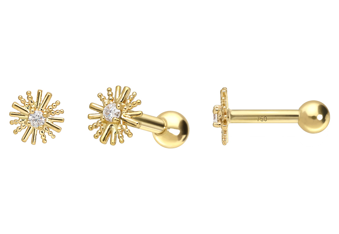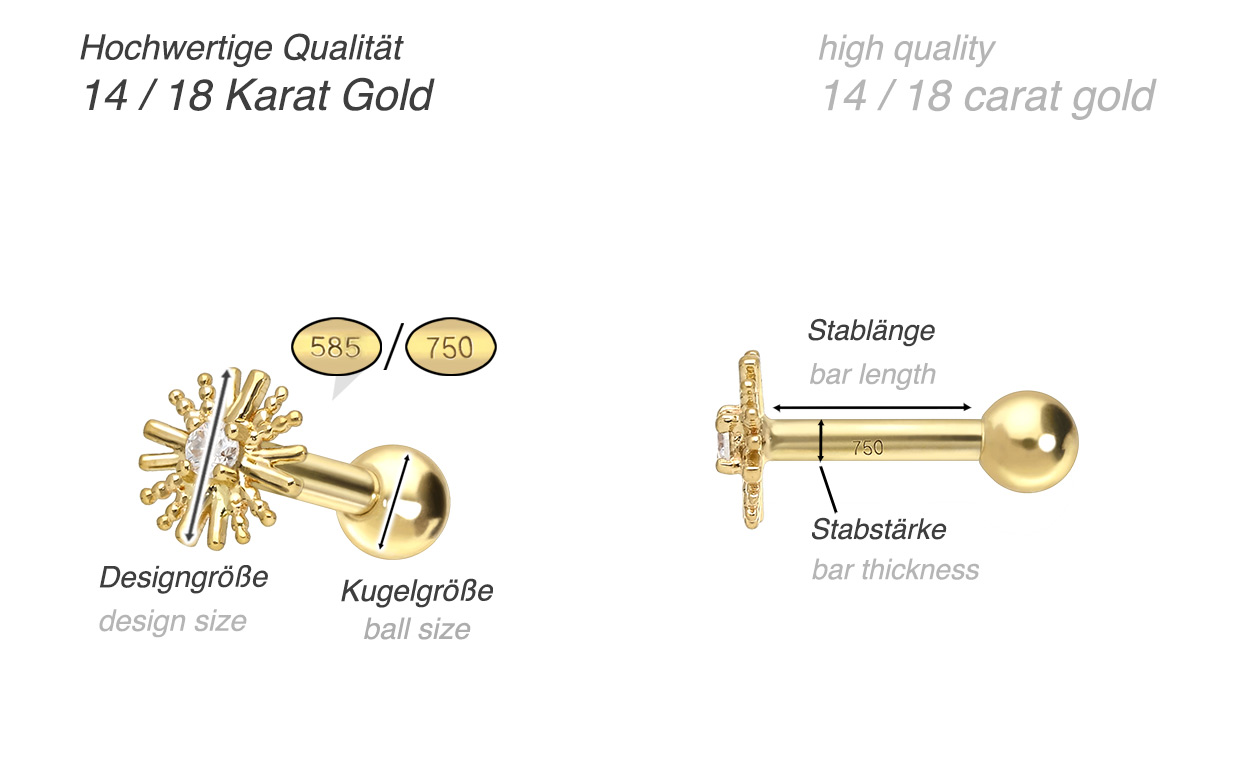Except for the moissanite, this precious ear piercing is made entirely of high quality 14 carat (585) or 18 carat (750) yellow gold, which in addition to its excellent quality also knows how to impress with properties such as good skin compatibility and high durability. The moissanite gives the piece of jewellery its extraordinary, diamond-like shine. Each and every one of our gold items is handcrafted with great attention to detail, making it one of a kind. The rear ball of this delightful piece of jewelry can be unscrewed, while the front design in form of a flower is firmly attached to the bar. Said bar always has a thickness of 1.2 mm, whereas its length is 6 mm.