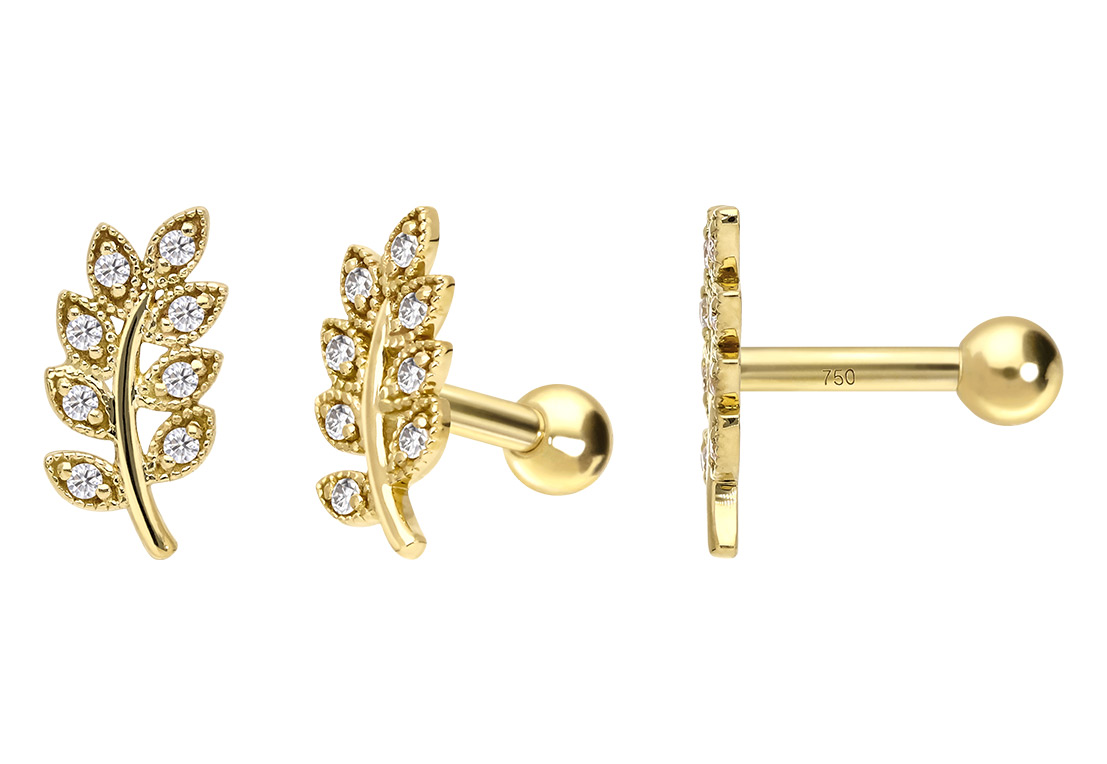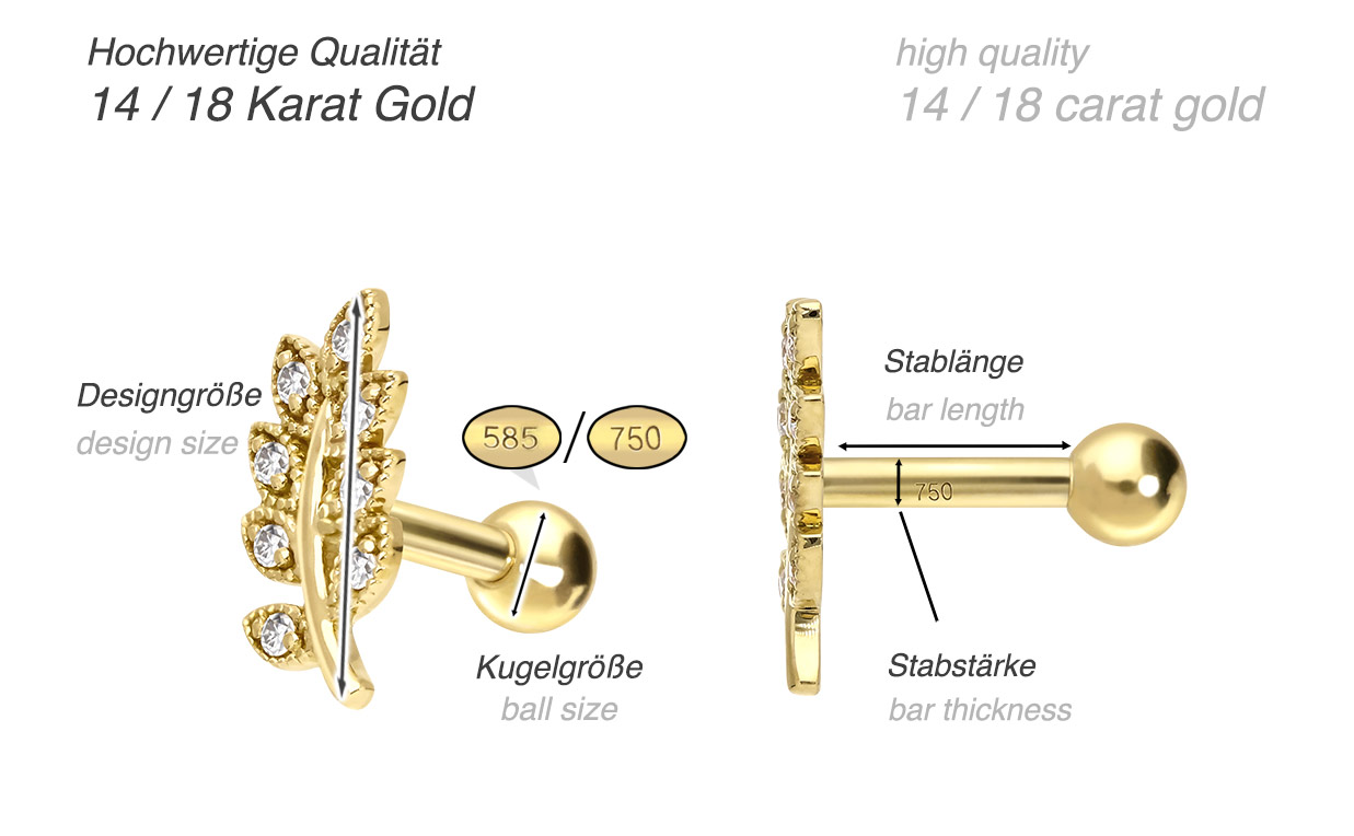 Except for the moissanites, this precious ear piercing is made entirely of high quality 14 carat (585) or 18 carat (750) yellow gold, which in addition to its excellent quality also knows how to impress with properties such as good skin compatibility and high durability. The moissanite gives the piece of jewellery its extraordinary, diamond-like shine. Each and every one of our gold items is handcrafted with great attention to detail, making it one of a kind. The rear ball of this delightful piece of jewelry can be unscrewed, while the front design in form of several leaves is firmly attached to the bar. Said bar always has a thickness of 1.2 mm, whereas its length is 6 mm.