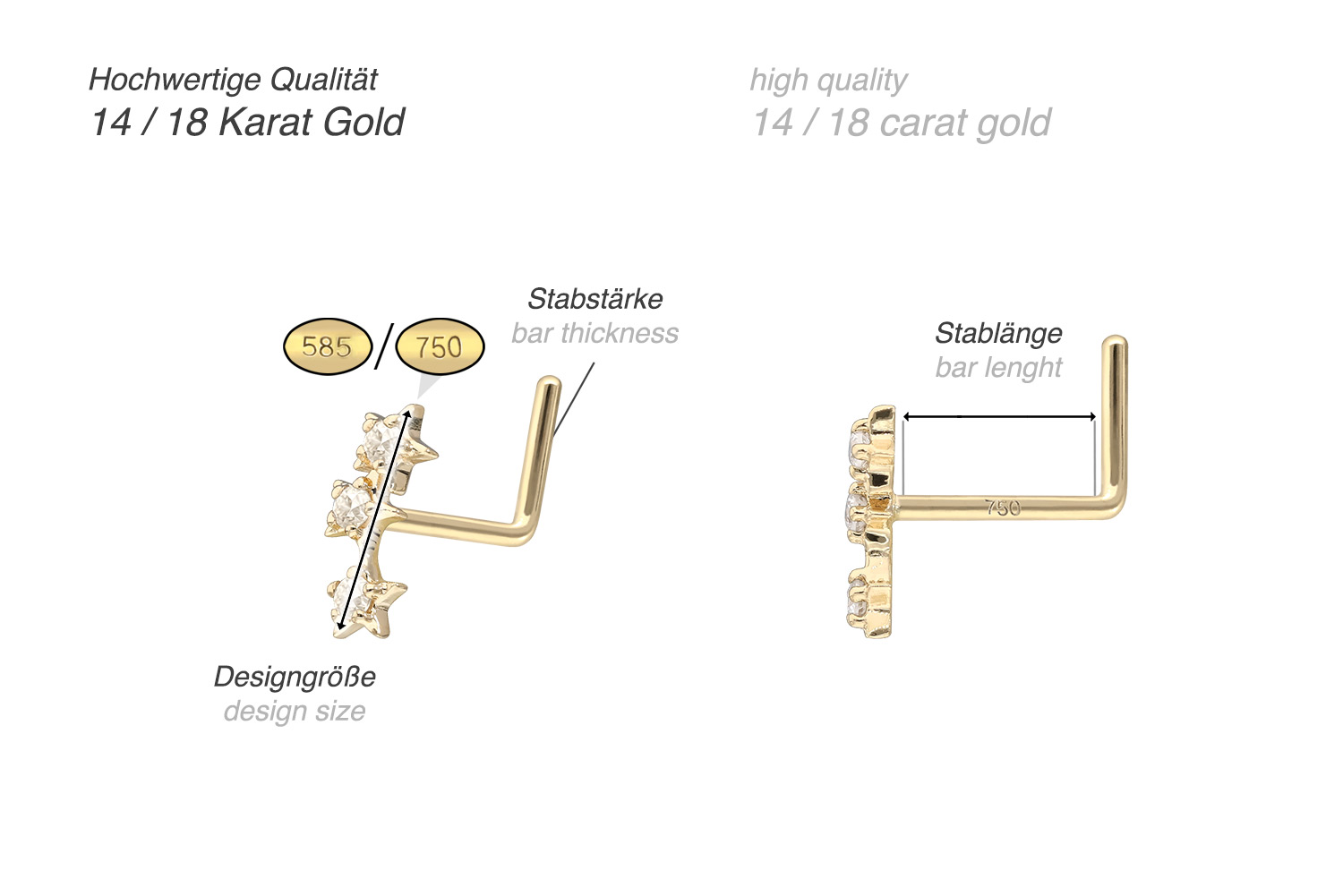 Design size (3 moissanite stars): 3 x 7 mm14/18 Carat Gold - Nose Stud L-Form 3 Moissanite Stars