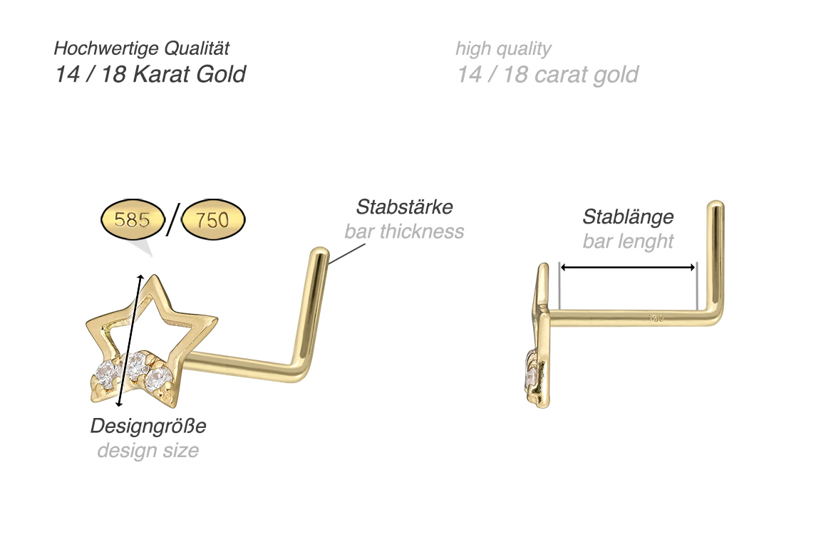 Except for the moissanites, this nose stud with the design in form of a star is made entirely of high quality 14 carat (585) or 18 carat (750) yellow gold, which in addition to its excellent quality also knows how to impress with properties such as good skin compatibility and high durability. The moissanite gives the piece of jewellery its extraordinary, diamond-like shine. Each and every one of our gold items is handcrafted with great attention to detail, making it one of a kind. Thanks to the L-shaped bar of this piece of jewelry, a particularly firm hold in the nose is ensured. It always has a bar thickness of 0.8 mm, whereas its bar length is 6 mm.