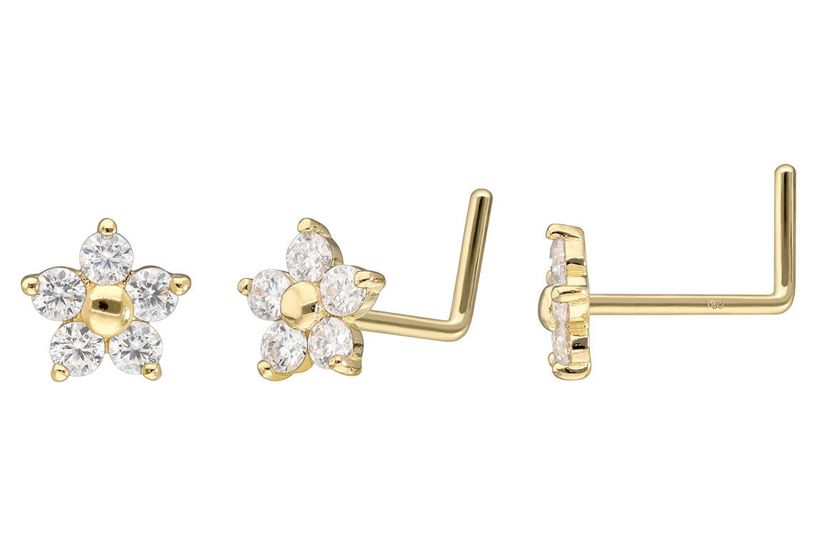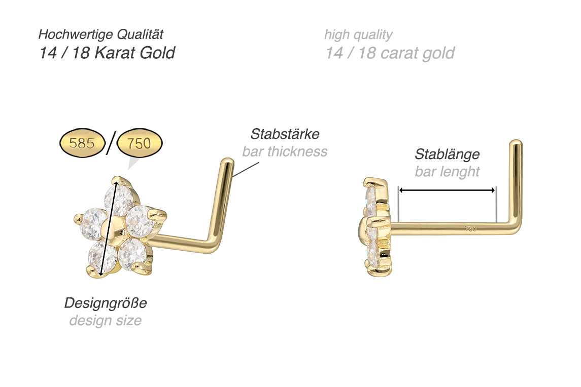 Except for the moissanites, this nose stud with the design in form of a flower is made entirely of high quality 14 carat (585) or 18 carat (750) yellow gold, which in addition to its excellent quality also knows how to impress with properties such as good skin compatibility and high durability. The moissanite gives the piece of jewellery its extraordinary, diamond-like shine. Each and every one of our gold items is handcrafted with great attention to detail, making it one of a kind. Thanks to the L-shaped bar of this piece of jewelry, a particularly firm hold in the nose is ensured. It always has a bar thickness of 0.8 mm, whereas its bar length is 6 mm.