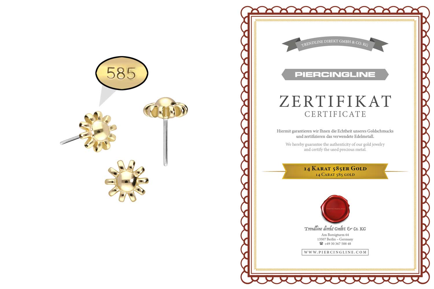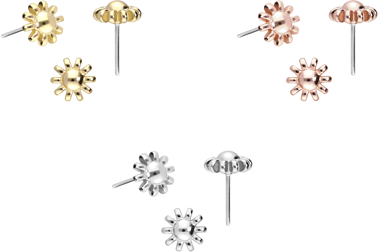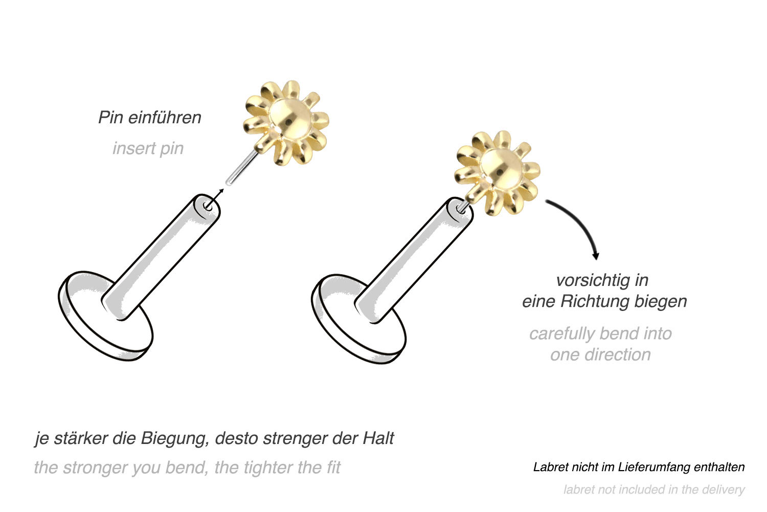 This timelessly beautiful push pin attachment in form of a flower is made entirely of high quality 14 carat (585) gold, which in addition to its excellent quality also knows how to impress with properties such as good skin compatibility and high durability. Only the push pin is made of titanium (grade 23). Color-wise, it is available in yellow gold, rose gold and rhodium-plated white gold. Each and every one of our gold items is handcrafted with great attention to detail, making it one of a kind. For insertion, the pin must be bent as desired. It should be noted that a firmer hold is ensured when the pin is bent a little more. Since the push pin attachment is compatible with all our 14 carat (585) gold products with push fit, there are various combination possibilities.