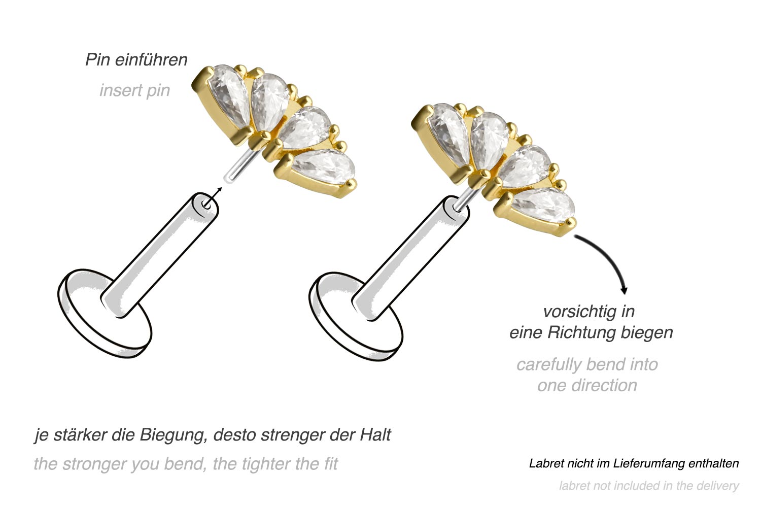 Except for the moissanites, this timelessly beautiful push pin attachment in form of an arch is made entirely of high quality 14 carat (585) gold, which in addition to its excellent quality also knows how to impress with properties such as good skin compatibility and high durability. Only the push pin is made of titanium (grade 23). Color-wise, it is available in yellow gold, rose gold and rhodium-plated white gold. The moissanites give the piece of jewellery its extraordinary, diamond-like shine. Each and every one of our gold items is handcrafted with great attention to detail, making it one of a kind. For insertion, the pin must be bent as desired. It should be noted that a firmer hold is ensured when the pin is bent a little more. Since the push pin attachment is compatible with all our gold products with push fit, there are various combination possibilities.