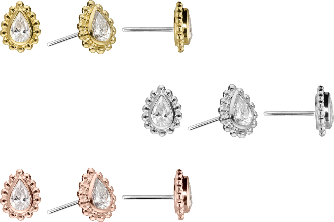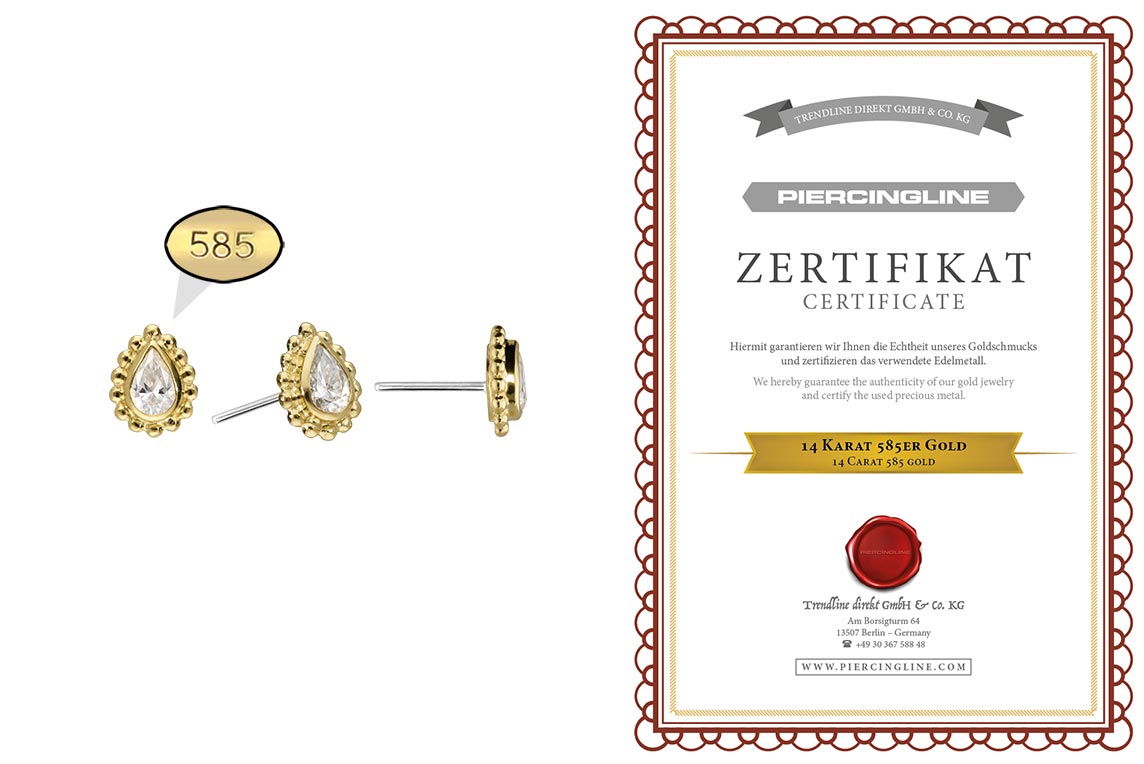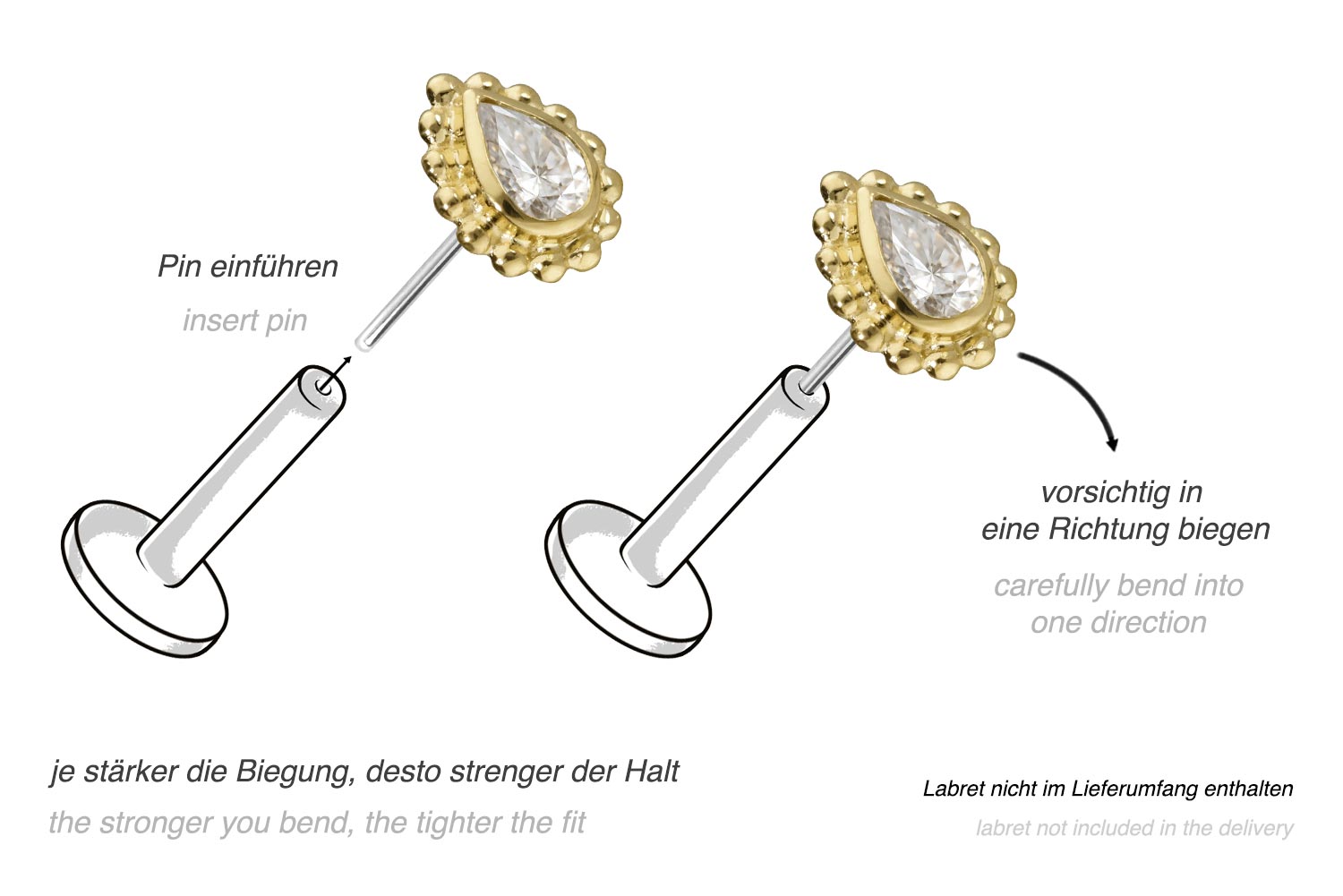 Except for the moissanite, this timelessly beautiful push pin attachment in form of a drop, which is surrounded by several balls, is made entirely of high quality 14 carat (585) gold, which in addition to its excellent quality also knows how to impress with properties such as good skin compatibility and high durability. Only the push pin is made of titanium (grade 23). Color-wise, it is available in yellow gold, rose gold and rhodium-plated white gold. The moissanites give the piece of jewellery its extraordinary, diamond-like shine. Each and every one of our gold items is handcrafted with great attention to detail, making it one of a kind. For insertion, the pin must be bent as desired. It should be noted that a firmer hold is ensured when the pin is bent a little more. Since the push pin attachment is compatible with all our 14 carat (585) gold products with push fit, there are various combination possibilities.