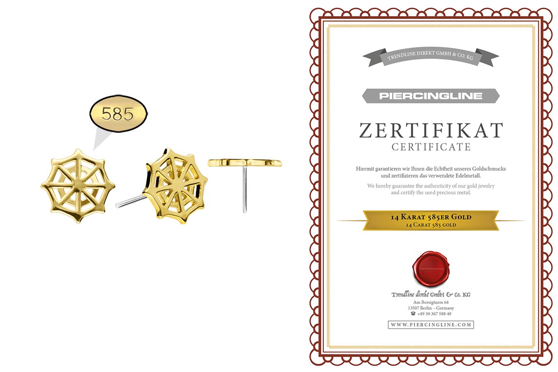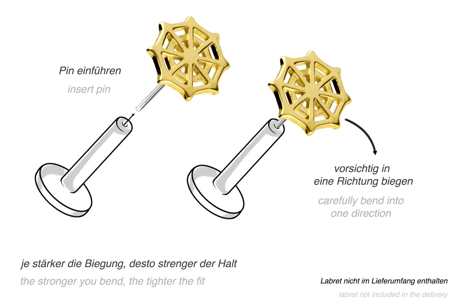 This timelessly beautiful push pin attachment in form of a spiderweb is made entirely of high quality 14 carat (585) gold, which in addition to its excellent quality also knows how to impress with properties such as good skin compatibility and high durability. Only the push pin is made of titanium (grade 23). Color-wise, it is available in yellow gold, rose gold and rhodium-plated white gold. Each and every one of our gold items is handcrafted with great attention to detail, making it one of a kind. For insertion, the pin must be bent as desired. It should be noted that a firmer hold is ensured when the pin is bent a little more. Since the push pin attachment is compatible with all our 14 carat (585) gold products with push fit, there are various combination possibilities.
