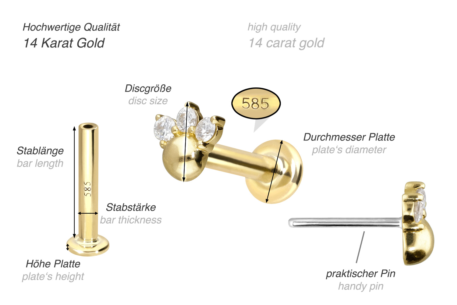 Except for the moissanites, this labret is made of high-quality 14 carat (585) gold, which, in addition to its excellent quality, also impresses with properties such as good skin compatibility and high durability. It is available in yellow gold, rose gold and rhodium-plated white gold. The labret is supplied with a timelessly beautiful attachment with titanium push pin, has a bar thickness of either 1 or 1.2 mm and is available in the bar lengths listed below. The moissanite gives the piece of jewellery its extraordinary, diamond-like shine. Every single one of our gold items is handcrafted with great attention to detail and is therefore unique. Thanks to the push fit technology used, the labret can be combined with any of our gold attachments with titanium push pin.