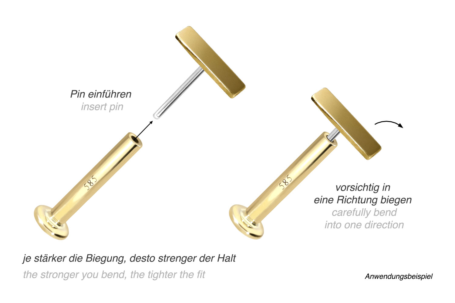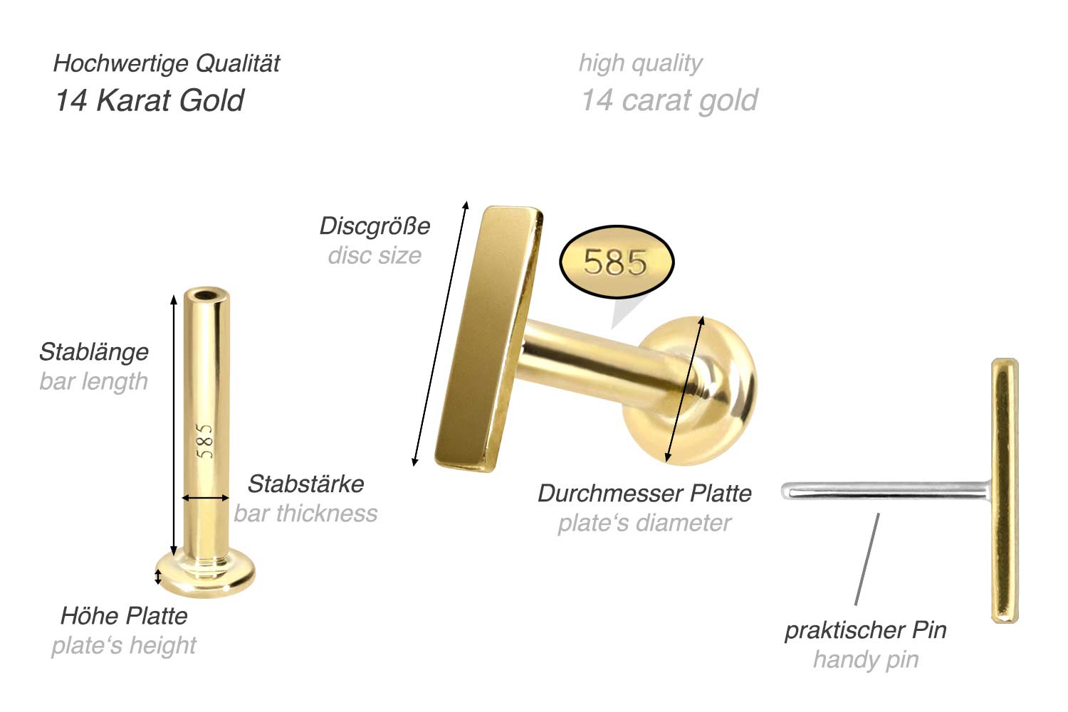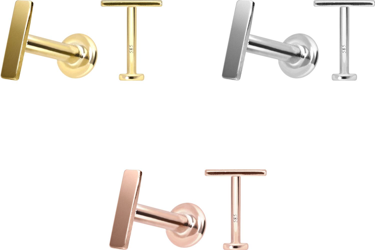 This labret is made of high-quality 14 carat (585) gold, which, in addition to its excellent quality, also impresses with properties such as good skin compatibility and high durability. It is available in yellow gold, rose gold and rhodium-plated white gold. The labret is supplied with a timelessly beautiful attachment with titanium push pin in form of a bar, has a bar thickness of either 1 or 1.2 mm and is available in the bar lengths listed below. Every single one of our gold items is handcrafted with great attention to detail and is therefore unique. Thanks to the push fit technology used, the labret can be combined with any of our gold attachments with titanium push pin.
