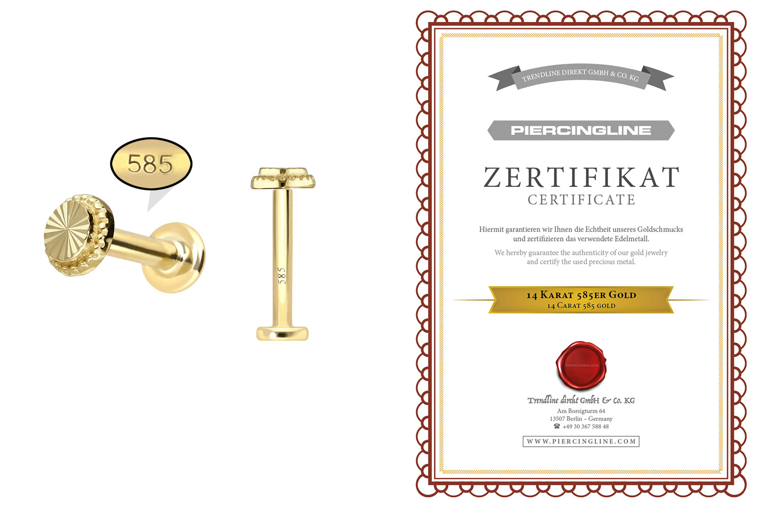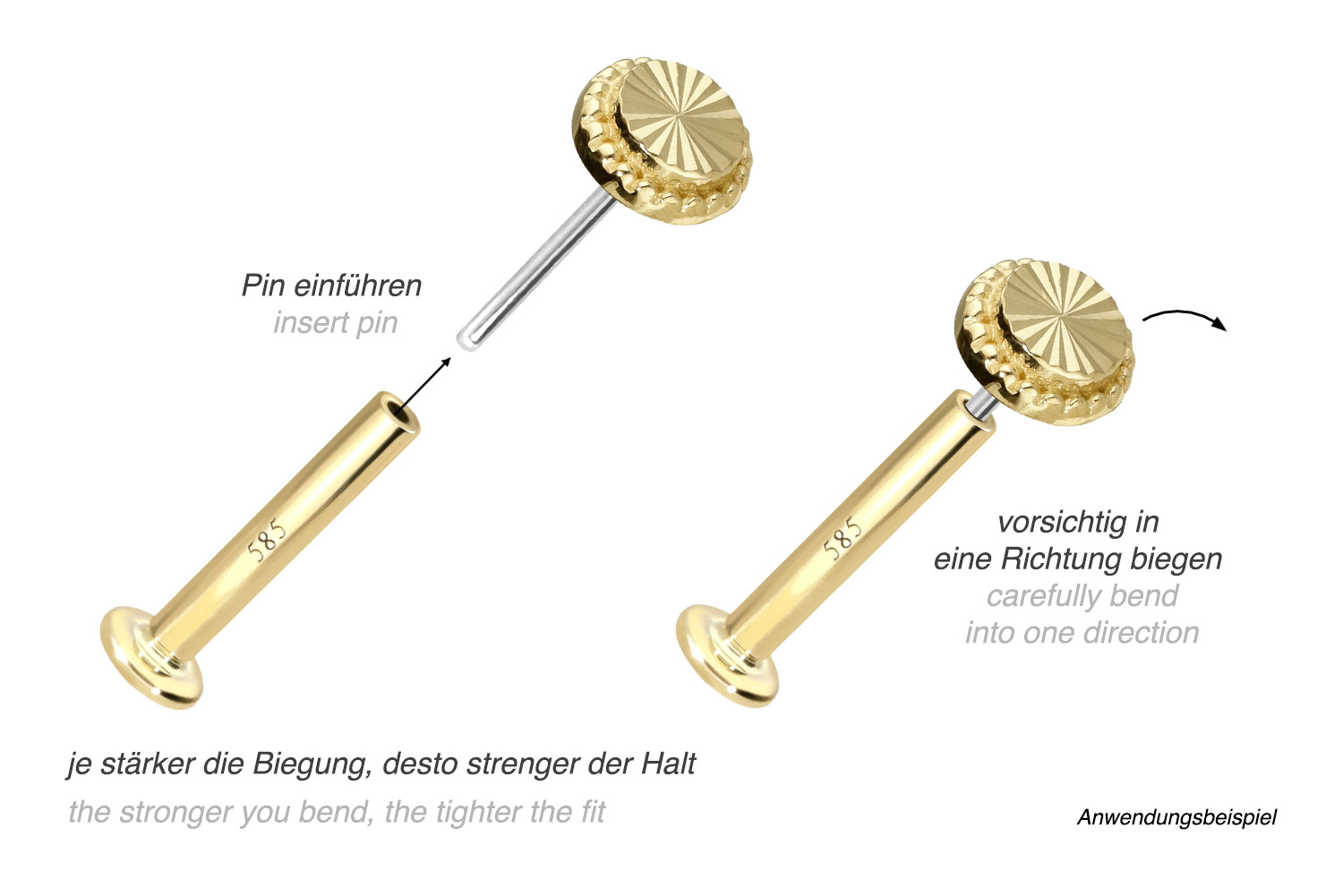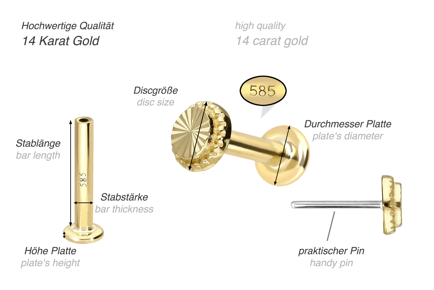 This labret is made of high-quality 14 carat (585) gold, which, in addition to its excellent quality, also impresses with properties such as good skin compatibility and high durability. It is available in yellow gold, rose gold and rhodium-plated white gold. The labret is supplied with a timelessly beautiful disc with titanium push pin, has a bar thickness of either 1 or 1.2 mm and is available in the bar lengths listed below. Every single one of our gold items is handcrafted with great attention to detail and is therefore unique. Thanks to the push fit technology used, the labret can be combined with any of our gold attachments with titanium push pin.
