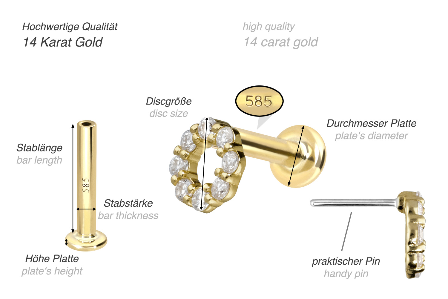 Except for the moissanites, this labret is made of high-quality 14 carat (585) gold, which, in addition to its excellent quality, also impresses with properties such as good skin compatibility and high durability. It is available in yellow gold, rose gold and rhodium-plated white gold. The labret is supplied with a timelessly beautiful attachment with titanium push pin in form of a circle, has a bar thickness of either 1 or 1.2 mm and is available in the bar lengths listed below. The moissanite gives the piece of jewellery its extraordinary, diamond-like shine. Every single one of our gold items is handcrafted with great attention to detail and is therefore unique. Thanks to the push fit technology used, the labret can be combined with any of our gold attachments with titanium push pin.