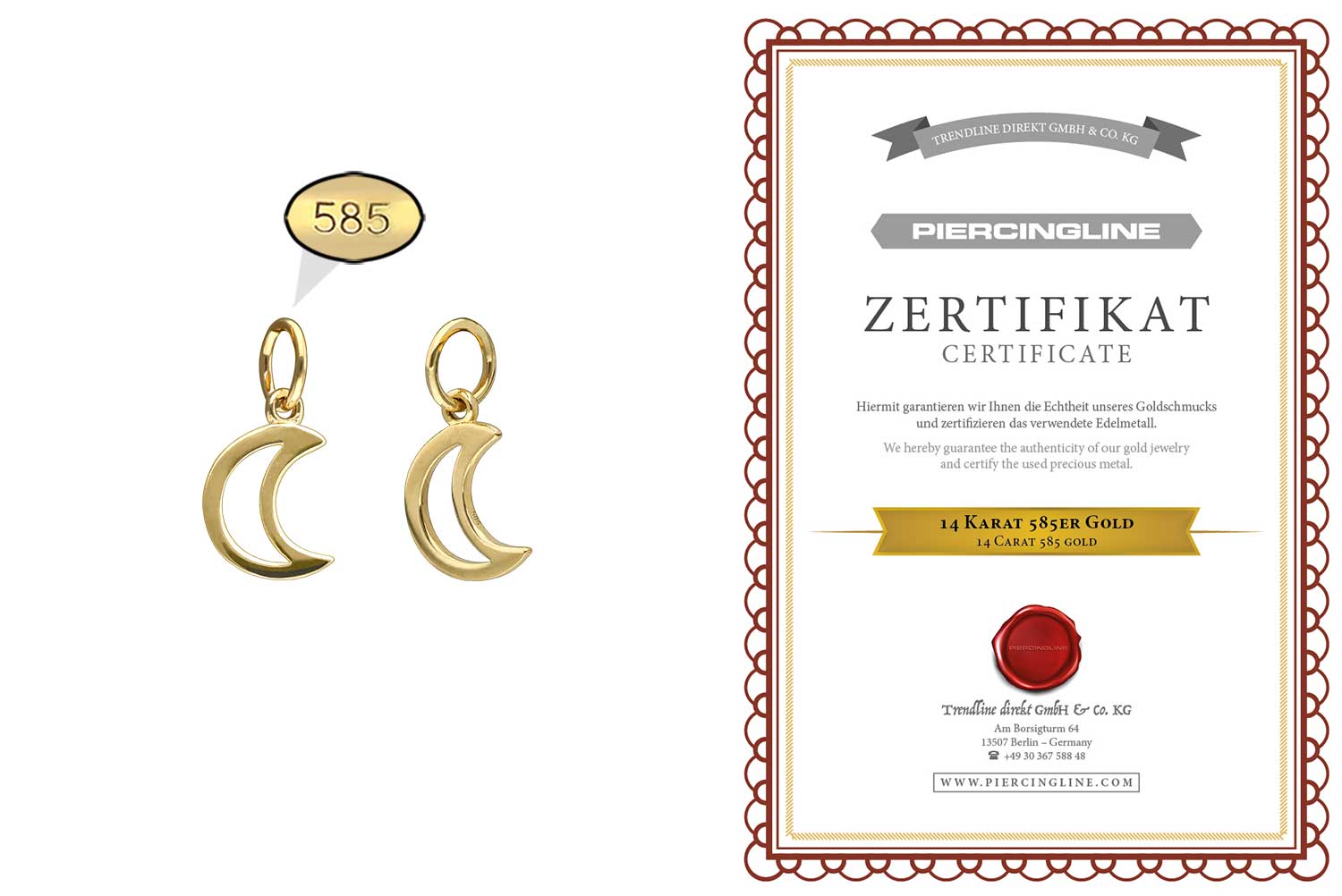 Clickers with a bar thickness from 0.8 mm to 2.5 mm are given an imaginative and thus also individual design thanks to our unique pendants! For this, the clicker must only be opened and the piece of jewelry attached. It is made entirely of high quality 14 carat (858) yellow gold, whose material properties include good skin compatibility and high durability. Each and every one of our gold items is handcrafted with great attention to detail, making it one of a kind. Thus, this delightful pendant in the shape of a moon becomes an excellent addition to any matching clicker!