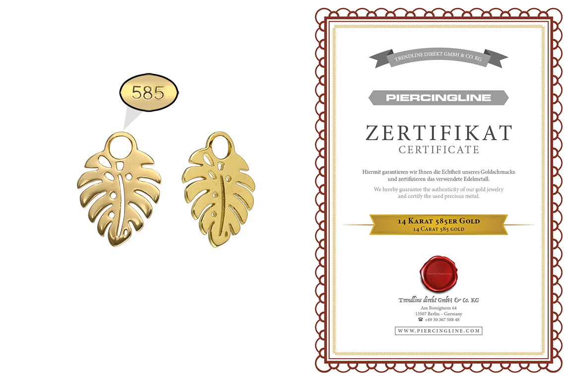 Clickers with a bar thickness from 0.8 mm to 2.5 mm are given an imaginative and thus also individual design thanks to our unique pendants! For this, the clicker must only be opened and the piece of jewelry attached. It is made entirely of high quality 14 carat (585) yellow gold, whose material properties include good skin compatibility and high durability. Each and every one of our gold items is handcrafted with great attention to detail, making it one of a kind. Thus, this delightful pendant in the shape of a palm leaf becomes an excellent addition to any matching clicker!
