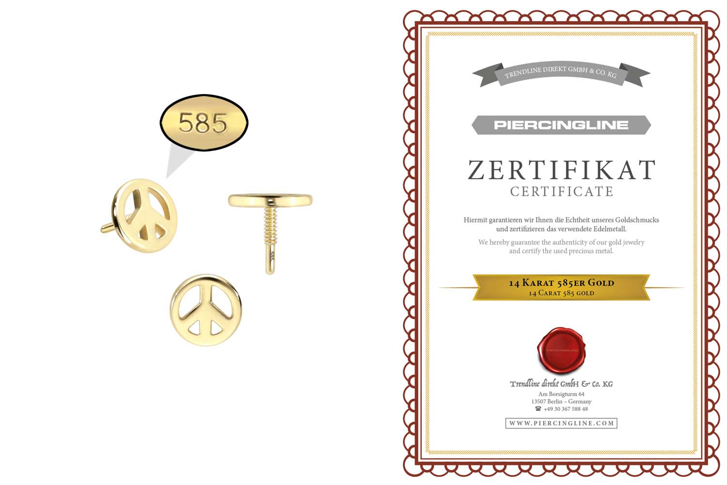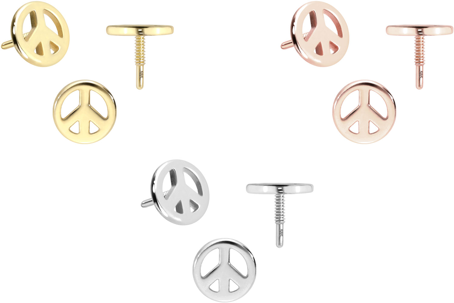 This timelessly beautiful screw-in attachment in form of a peace sign is made entirely of high quality 14 carat (585) gold, which in addition to its excellent quality also knows how to impress with properties such as good skin compatibility and high durability. Color-wise, it is available in yellow gold, rose gold and rhodium-plated white gold. Each and every one of our gold items is handcrafted with great attention to detail, making it one of a kind. Since the 0.8 mm external thread of the attachment is compatible with all our 14 carat (585) gold products with this kind of internal thread, there are various combination possibilities.
