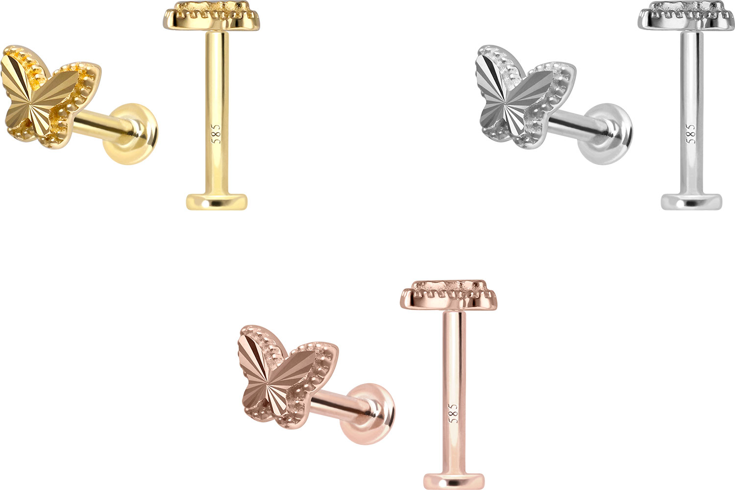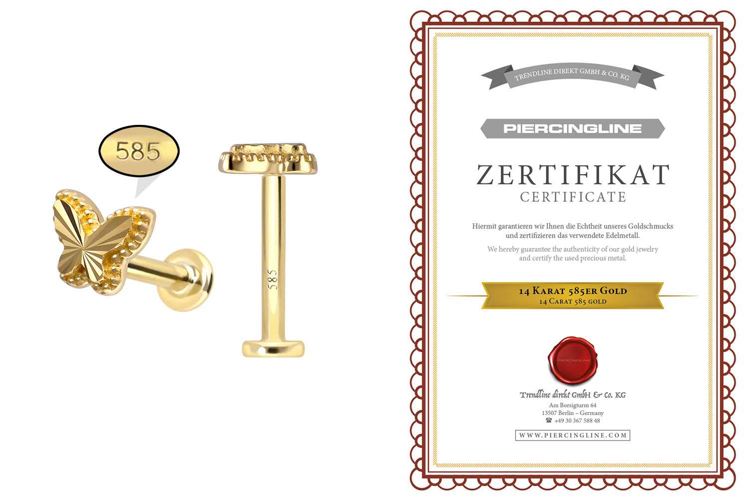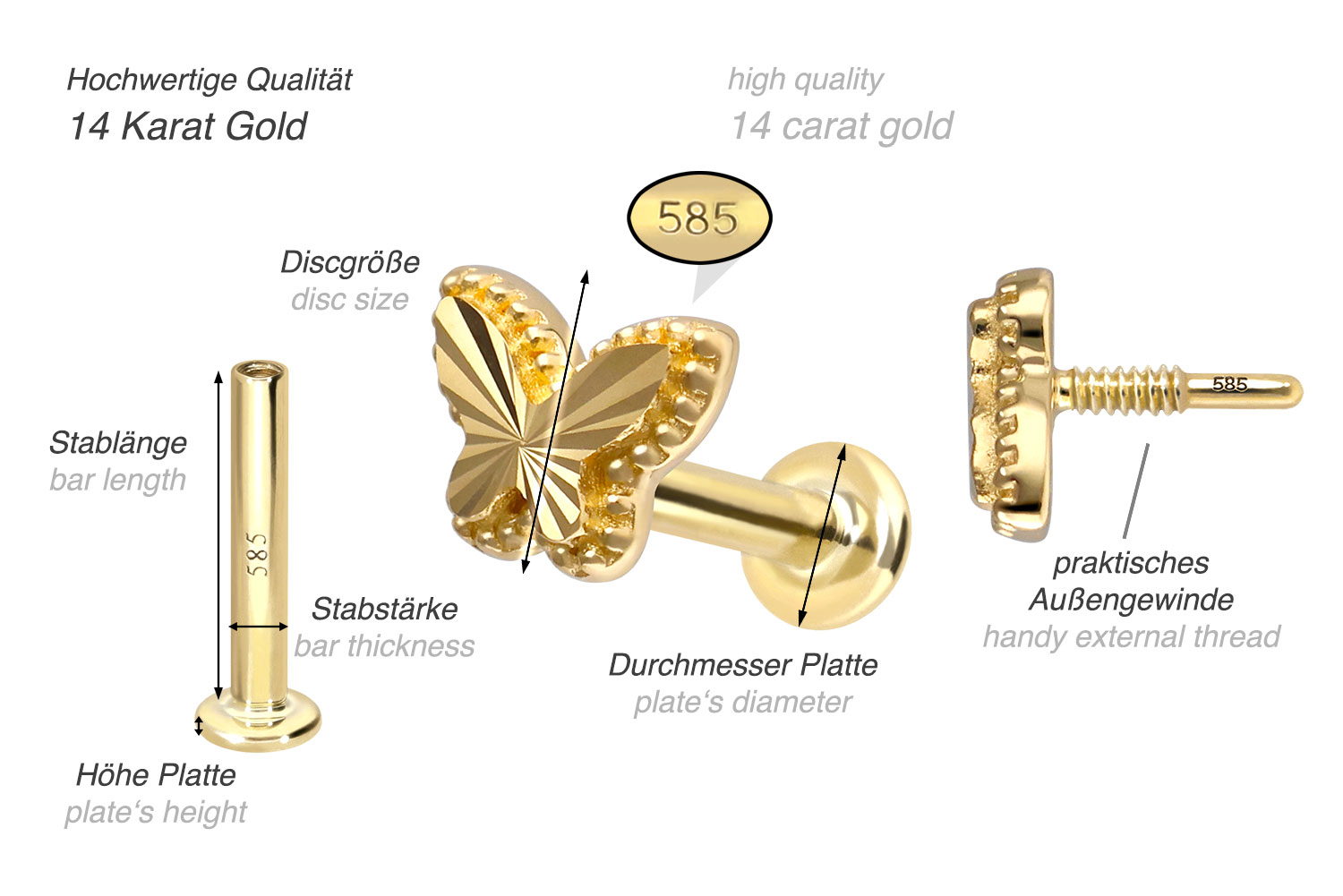 This labret is made entirely of high quality 14 carat (585) gold, which in addition to its excellent quality also knows how to impress with properties such as good skin compatibility and high durability. Color-wise, it is available in yellow gold, rose gold and rhodium-plated white gold. The labret is supplied with a timelessly beautiful screw-in attachment with external thread in form of a butterfly, has a bar thickness of either 1 or 1.2 mm and is available with the bar lengths listed below. Each and every one of our gold items is handcrafted with great attention to detail, making it one of a kind. Since the 0.8 mm internal thread of the labret is compatible with all our gold products with this kind of external thread, there are various combination possibilities.