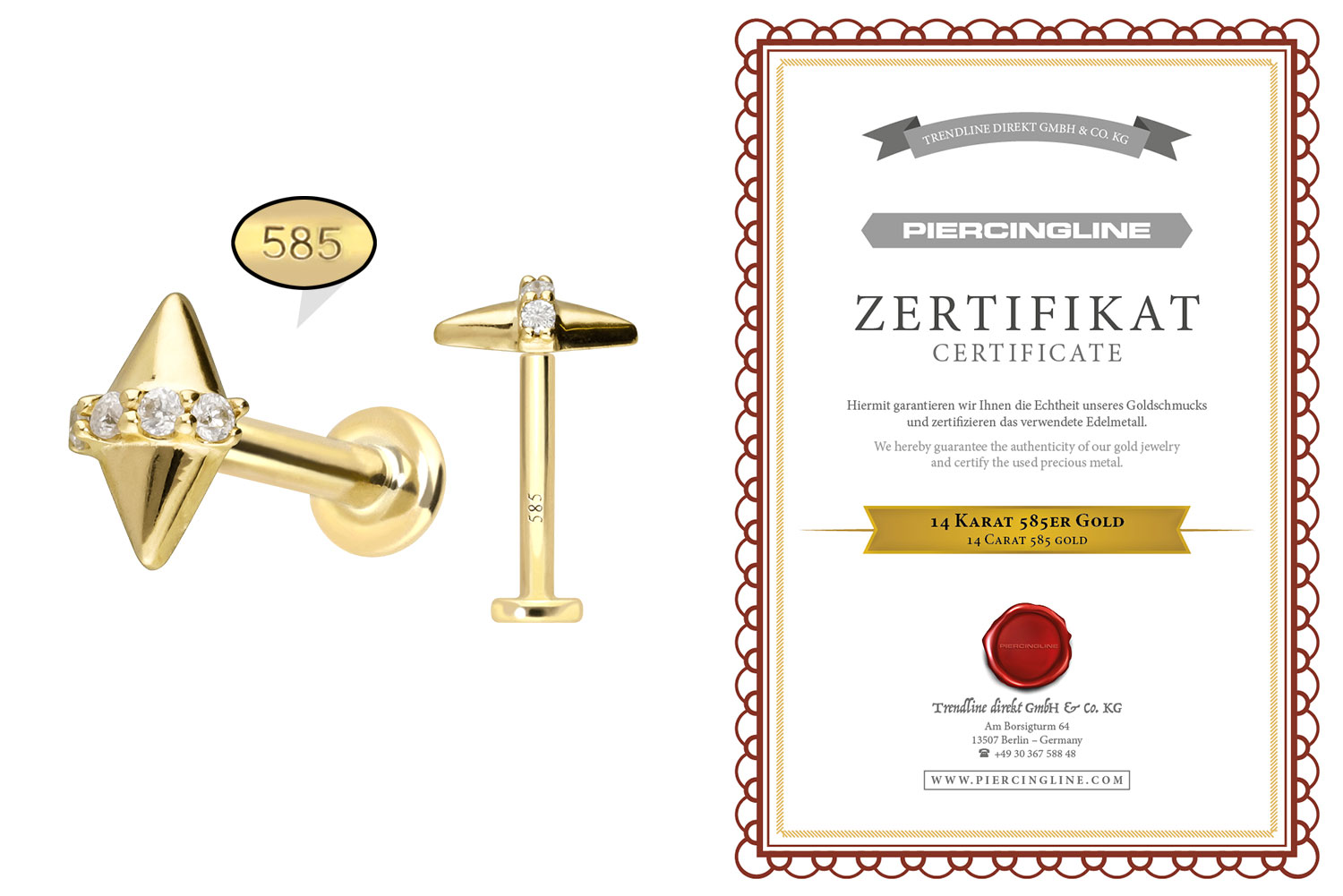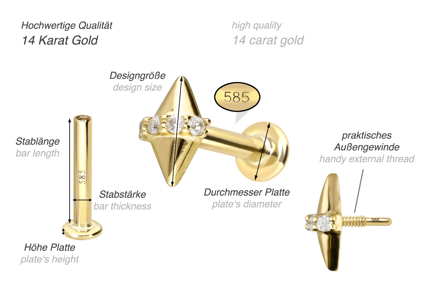 Except for the moissanites, this labret is made entirely of high quality 14 carat (585) gold, which in addition to its excellent quality also knows how to impress with properties such as good skin compatibility and high durability. Color-wise, it is available in yellow gold, rose gold and rhodium-plated white gold. The labret is supplied with a timelessly beautiful screw-in attachment with external thread in form of a moissanite surrounded by 2 spikes, has a bar thickness of either 1 or 1.2 mm and is available with the bar lengths listed below. The moissanite gives the piece of jewellery its extraordinary, diamond-like shine. Each and every one of our gold items is handcrafted with great attention to detail, making it one of a kind. Since the 0.8 mm internal thread of the labret is compatible with all our 14 carat (585) gold products with this kind of external thread, there are various combination possibilities.