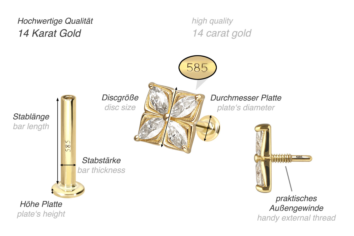 Except for the moissanites, this labret is made entirely of high quality 14 carat (585) gold, which in addition to its excellent quality also knows how to impress with properties such as good skin compatibility and high durability. Color-wise, it is available in yellow gold, rose gold and rhodium-plated white gold. The labret is supplied with a timelessly beautiful screw-in attachment with external thread in form of a flower, has a bar thickness of either 1 or 1.2 mm and is available with the bar lengths listed below. The moissanite gives the piece of jewellery its extraordinary, diamond-like shine. Each and every one of our gold items is handcrafted with great attention to detail, making it one of a kind. Since the 0.8 mm internal thread of the labret is compatible with all our gold products with this kind of external thread, there are various combination possibilities.