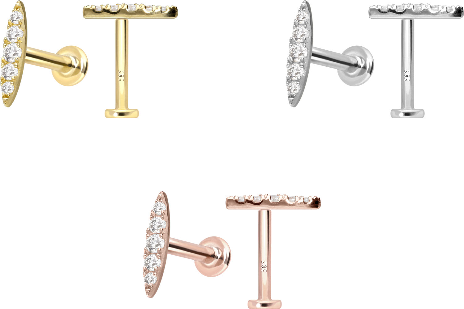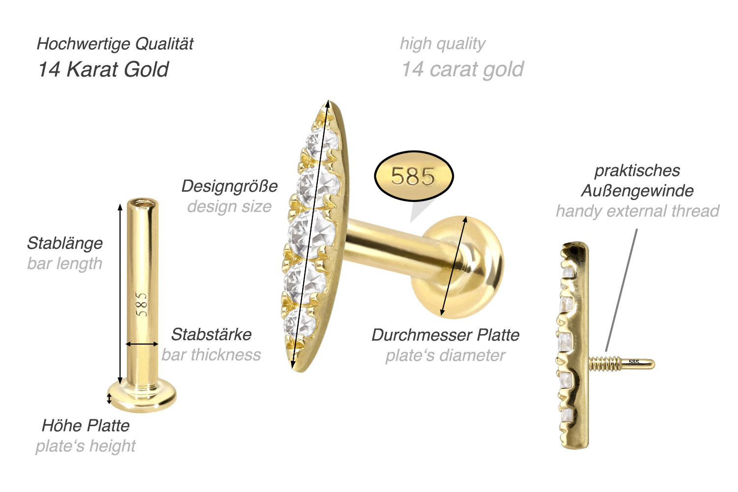 Except for the moissanites, this labret is made entirely of high quality 14 carat (585) gold, which in addition to its excellent quality also knows how to impress with properties such as good skin compatibility and high durability. Color-wise, it is available in yellow gold, rose gold and rhodium-plated white gold. The labret is supplied with a timelessly beautiful screw-in attachment with external thread in form of an oval, has a bar thickness of either 1 or 1.2 mm and is available with the bar lengths listed below. The moissanite gives the piece of jewellery its extraordinary, diamond-like shine. Each and every one of our gold items is handcrafted with great attention to detail, making it one of a kind. Since the 0.8 mm internal thread of the labret is compatible with all our gold products with this kind of external thread, there are various combination possibilities.