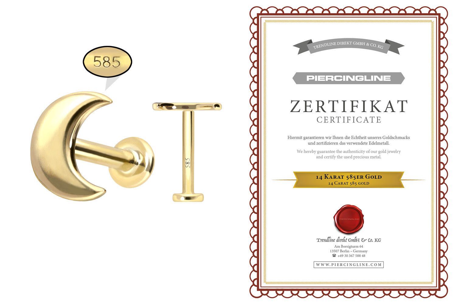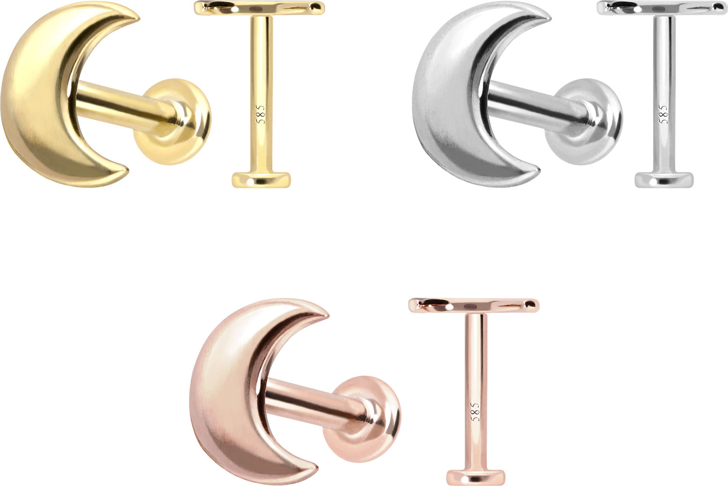 This labret is made entirely of high quality 14 carat (585) gold, which in addition to its excellent quality also knows how to impress with properties such as good skin compatibility and high durability. Color-wise, it is available in yellow gold, rose gold and rhodium-plated white gold. The labret is supplied with a timelessly beautiful screw-in attachment with external thread in form of a moon, has a bar thickness of either 1 or 1.2 mm and is available with the bar lengths listed below. Each and every one of our gold items is handcrafted with great attention to detail, making it one of a kind. Since the 0.8 mm internal thread of the labret is compatible with all our gold products with this kind of external thread, there are various combination possibilities.