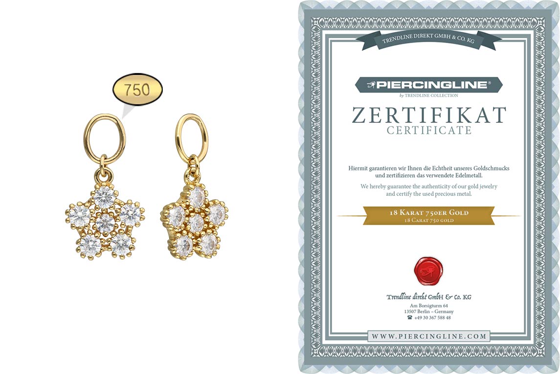 Clickers with a bar thickness from 0.8 mm to 2.5 mm are given an imaginative and thus also individual design thanks to our unique pendants! For this, the clicker must only be opened and the piece of jewelry attached. Except for the moissanites, it is made entirely of high quality 18 carat (750) yellow gold, whose material properties include good skin compatibility and high durability. The moissanite gives the piece of jewellery its extraordinary, diamond-like shine. Each and every one of our gold items is handcrafted with great attention to detail, making it one of a kind. Thus, this delightful pendant in the shape of a flower becomes an excellent addition to any matching clicker!