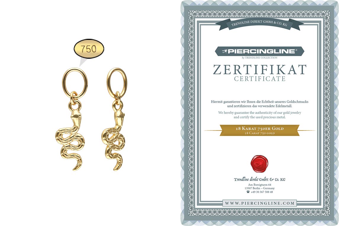Clickers with a bar thickness from 0.8 mm to 2.5 mm are given an imaginative and thus also individual design thanks to our unique pendants! For this, the clicker must only be opened and the piece of jewelry attached. It is made entirely of high quality 18 carat (750) yellow gold, whose material properties include good skin compatibility and high durability. Each and every one of our gold items is handcrafted with great attention to detail, making it one of a kind. Thus, this delightful pendant in the shape of a snake becomes an excellent addition to any matching clicker!