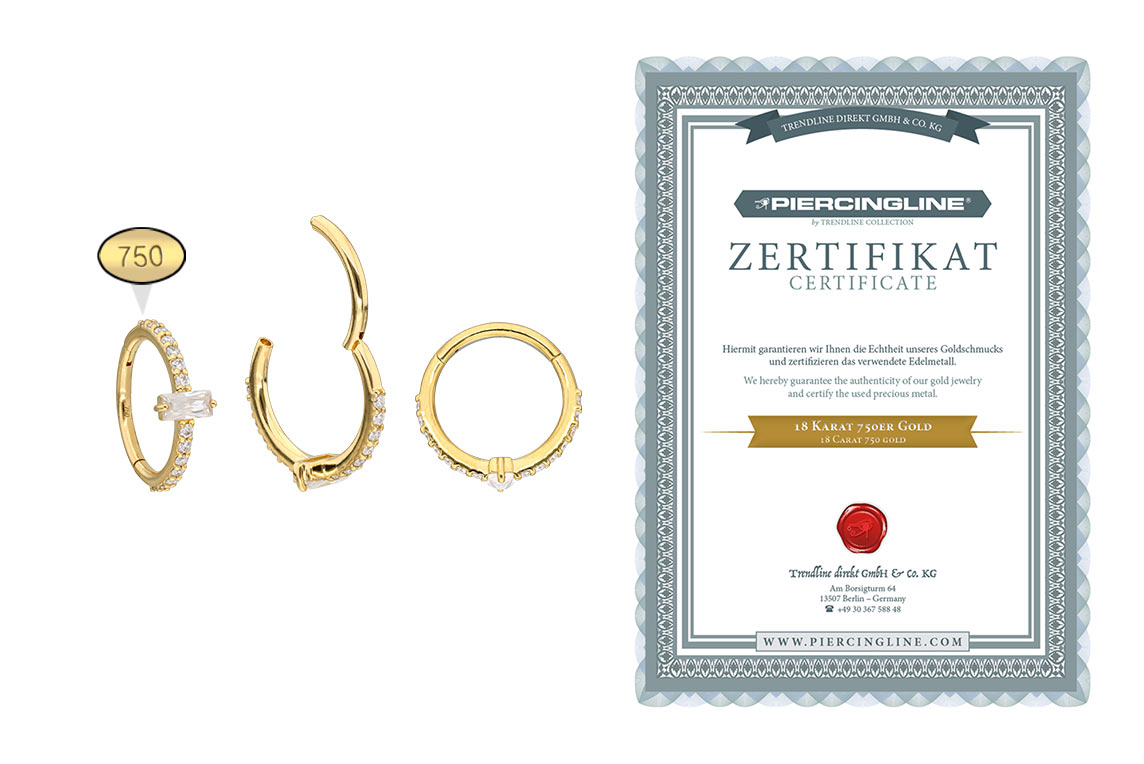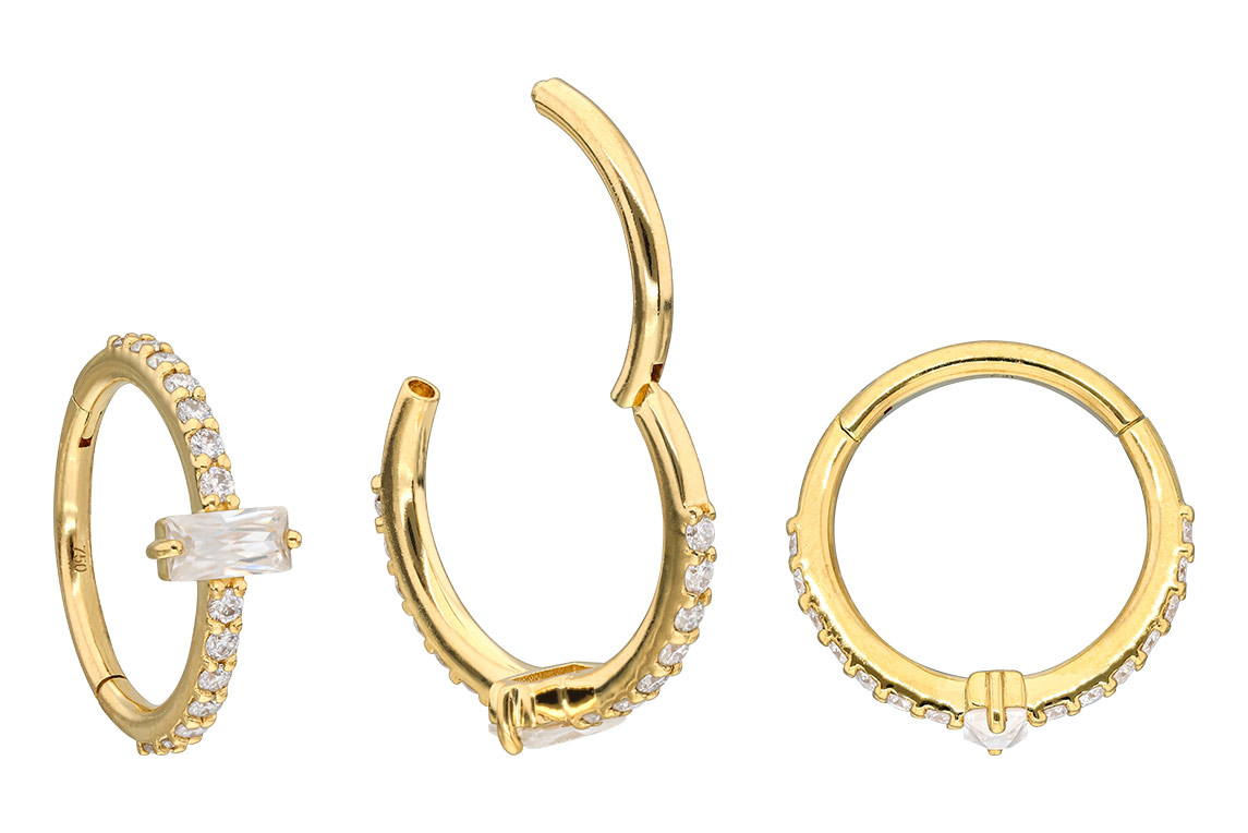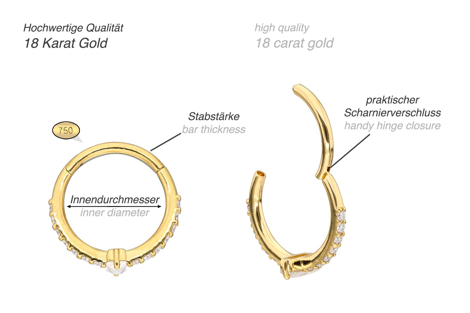 Easy handling and gorgeous design - that is what our clickers are all about! The main feature of the clickers is the practical hinge, which simplifies the piercing's insertion. Except for the moissanites, this precious clicker is made entirely of high quality 18 carat (750) yellow gold, which in addition to its excellent quality also knows how to impress with properties such as good skin compatibility and high durability. The moissanite gives the piece of jewellery its extraordinary, diamond-like shine. Each and every one of our gold items is handcrafted with great attention to detail, making it one of a kind. As a special highlight, the design in form of a moissanite rectangle, which is surrounded by several moissanites, adorns the stylish clicker. Whether at the ear, the nose or the lip - our clickers are suitable for a variety of different piercing locations. This clicker has a bar thickness of 1.2 mm, while its available inner diameters are listed below.