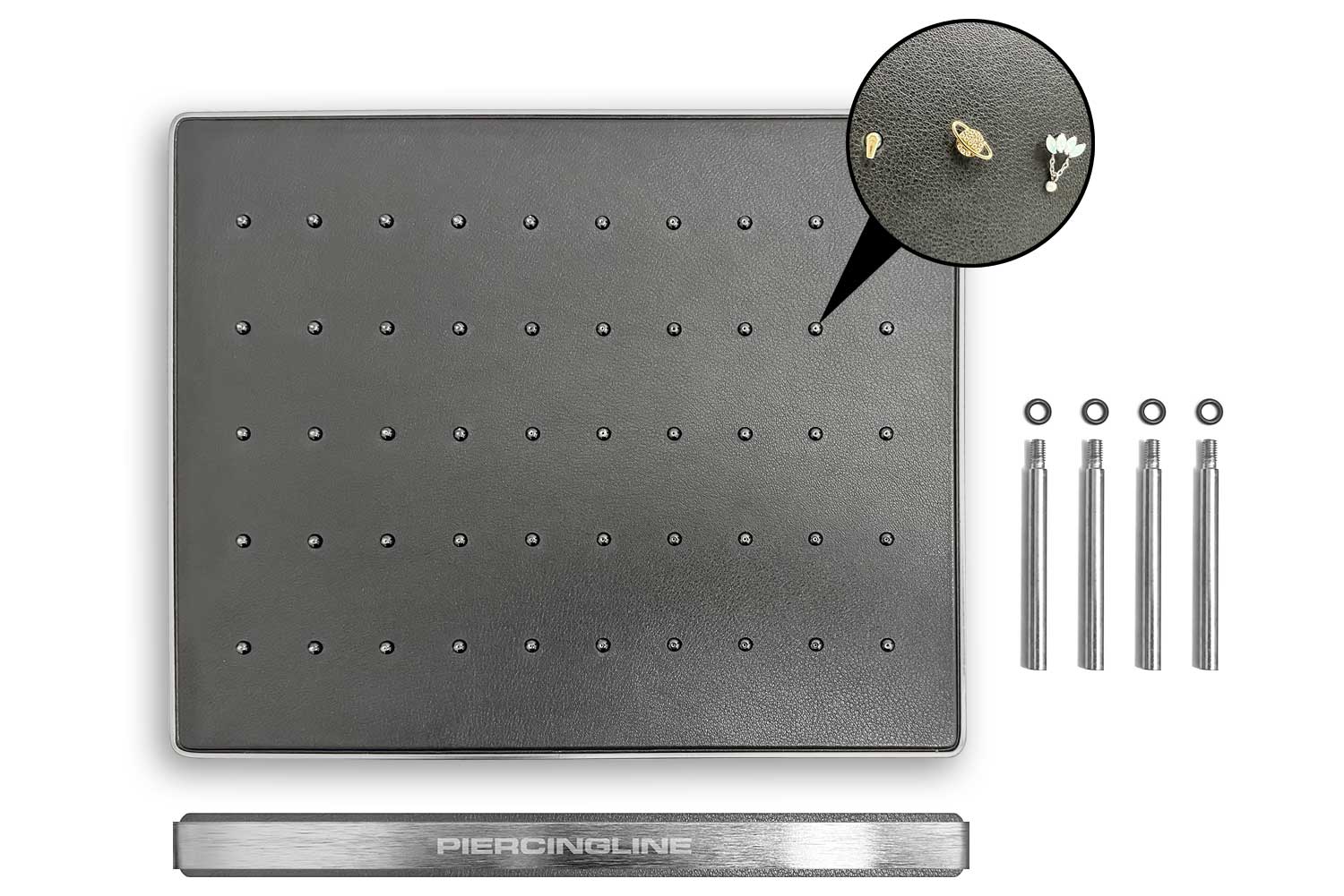 This high quality imitation leather display is perfectly suited for the presentation of push pin attachments. The jewelry can be easily inserted into the 28 or 50 slots provided for this purpose and removed again. The stainless steel frame gives the display an elegant finish. The individually screw-on stands ensure a secure hold and allow the products to be presented in many different appealing ways on the counter or even in a diplay case.
