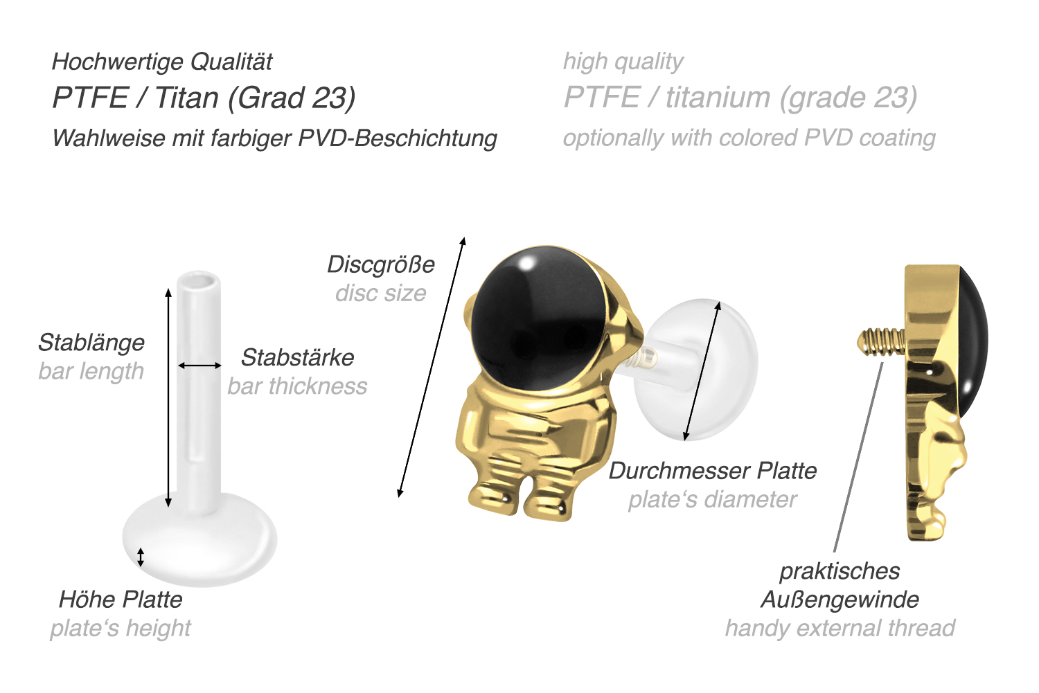 This unique labret is made of high quality PTFE, also known under the trade name Teflon. Only the screw-in attachment with external thread in form of an astronaut consists of titanium instead. In addition to their excellent quality, both materials feature other useful properties such as particularly good skin compatibility and durability. PTFE has the additional advantages of flexibility and adaptability. In the case of this item, the latter is noticeable in the fact that the bar can be shortened as desired with ordinary household scissors. A new thread can then be screwed in with the help of the attachment, so that an optimal hold is maintained. The advantages of titanium include color fastness, also guaranteed in the colored versions with PVD coating. The labret has a bar thickness of either 1.2 or 1.6 mm and is available with the bar lengths listed below. Furthermore, its 0.9 mm internal thread can be combined at will with all of our other screw-in attachments with this kind of external thread.