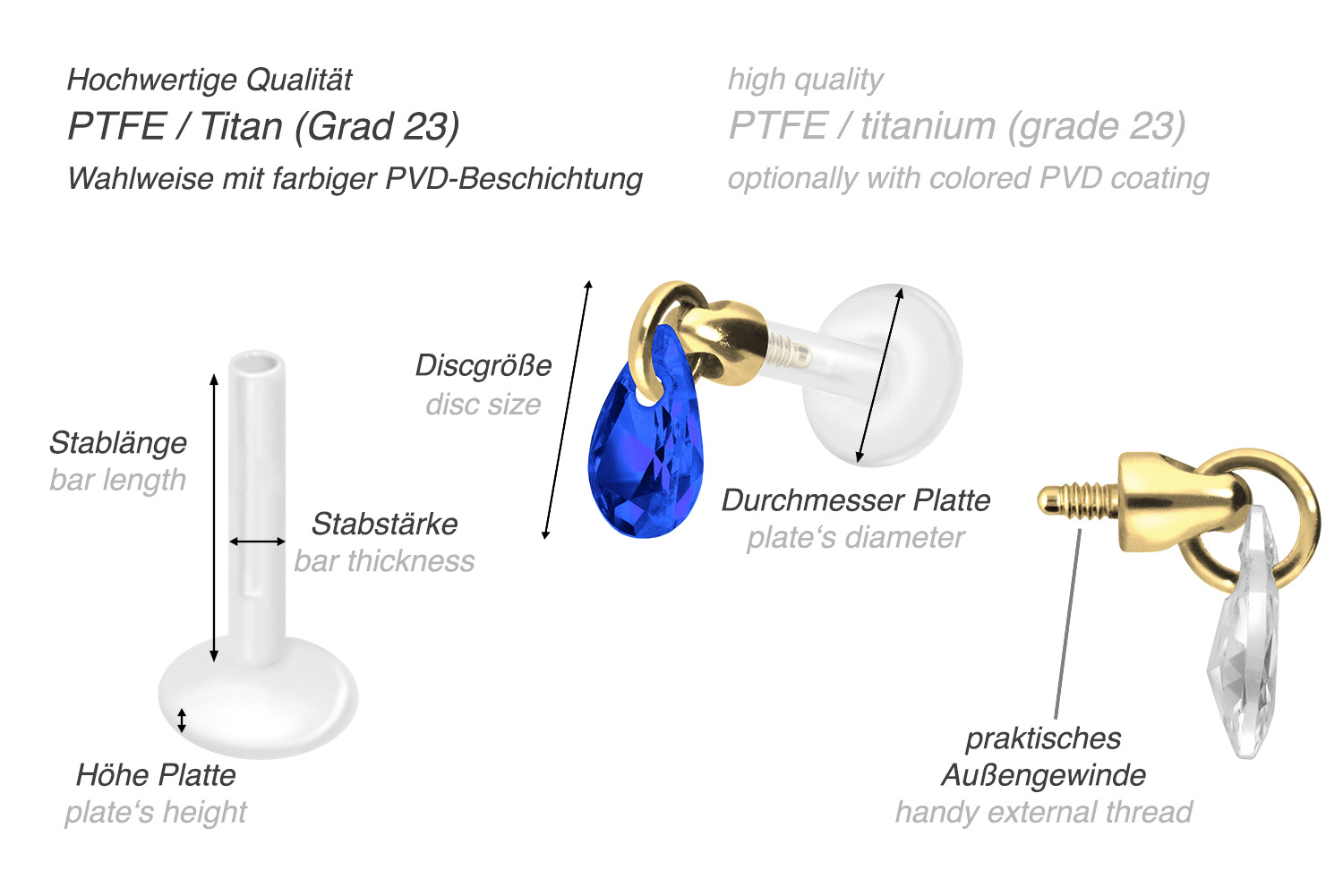 This unique labret is made of high quality PTFE, also known under the trade name Teflon. Only the screw-in attachment with external thread in form of a sparkling drop consists of titanium instead. In addition to their excellent quality, both materials feature other useful properties such as particularly good skin compatibility and durability. PTFE has the additional advantages of flexibility and adaptability. In the case of this item, the latter is noticeable in the fact that the bar can be shortened as desired with ordinary household scissors. A new thread can then be screwed in with the help of the attachment, so that an optimal hold is maintained. The advantages of titanium include color fastness, also guaranteed in the colored versions with PVD coating. The labret has a bar thickness of either 1.2 or 1.6 mm and is available with the bar lengths listed below. Furthermore, its 0.9 mm internal thread can be combined at will with all of our other screw-in attachments with this kind of external thread.
