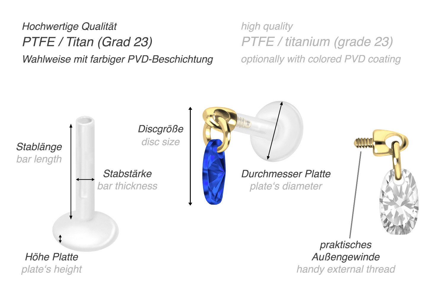 This unique labret is made of high quality PTFE, also known under the trade name Teflon. Only the screw-in attachment with external thread in form of a sparkling oval consists of titanium instead. In addition to their excellent quality, both materials feature other useful properties such as particularly good skin compatibility and durability. PTFE has the additional advantages of flexibility and adaptability. In the case of this item, the latter is noticeable in the fact that the bar can be shortened as desired with ordinary household scissors. A new thread can then be screwed in with the help of the attachment, so that an optimal hold is maintained. The advantages of titanium include color fastness, also guaranteed in the colored versions with PVD coating. The labret has a bar thickness of either 1.2 or 1.6 mm and is available with the bar lengths listed below. Furthermore, its 0.9 mm internal thread can be combined at will with all of our other screw-in attachments with this kind of external thread.