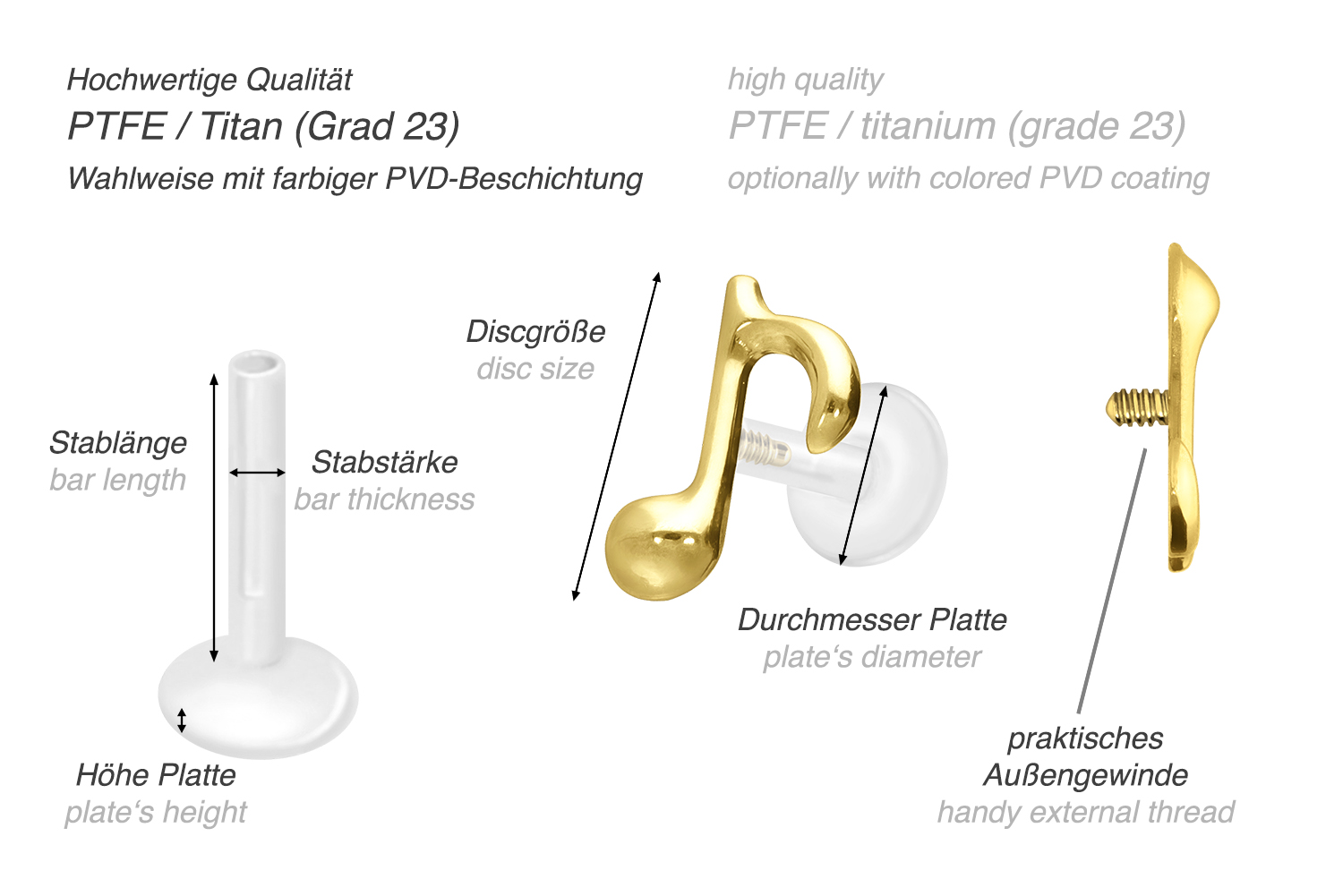 PTFE labret with internal thread + titanium attachment EIGHTH NOTE