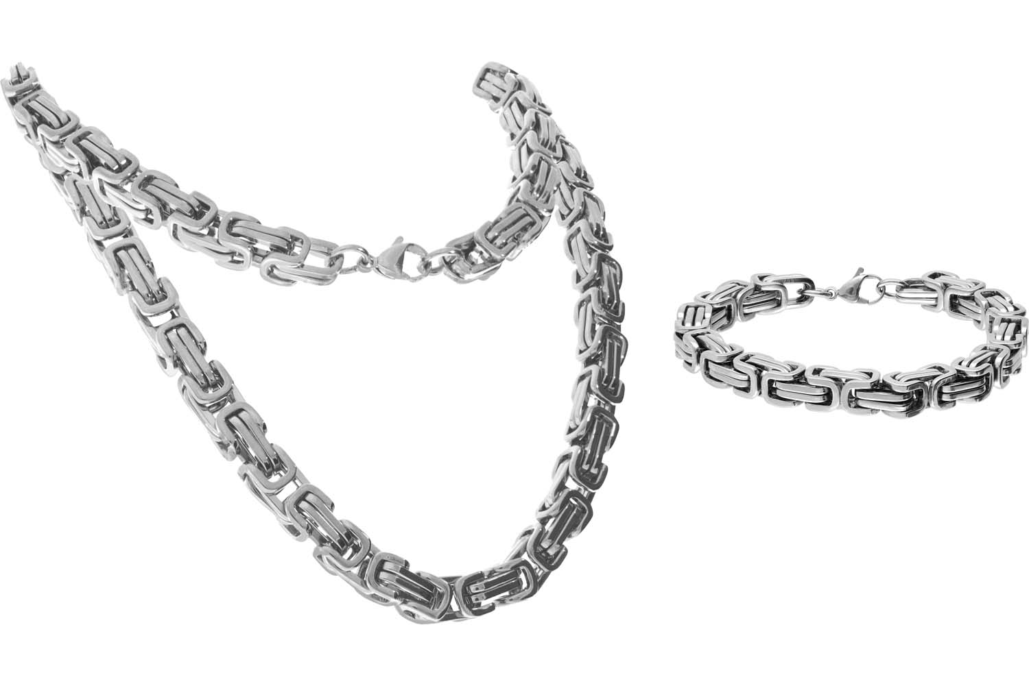 This set consists of a classic king chain and a matching king bracelet. Both are made of high quality stainless steel and particularly catch the eye because of their timelessly beautiful appearance. This unique aesthetic is further emphasized by