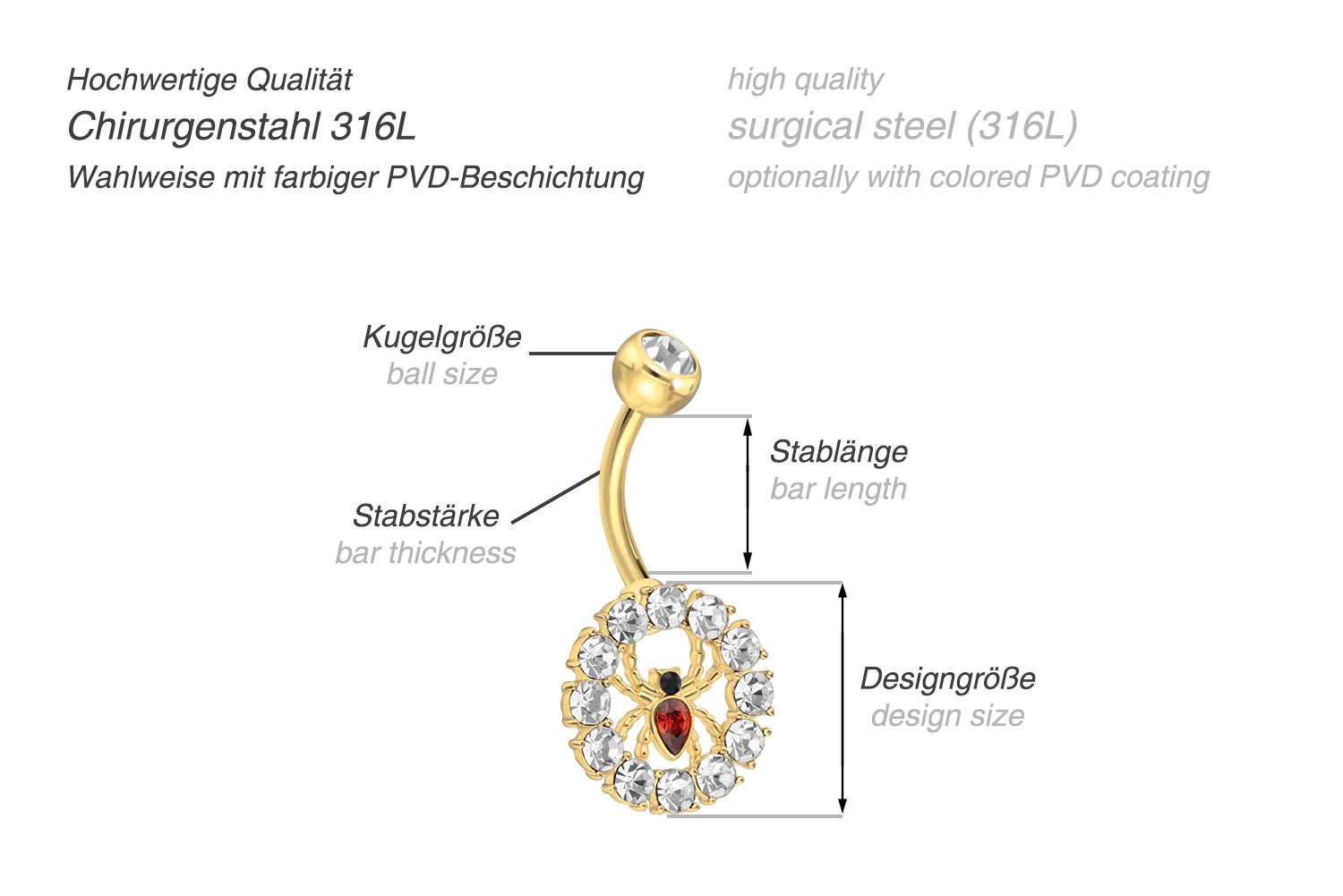 This bananabell is made of high quality surgical steel 316L, which is covered with a scratch-resistant PVD coating, depending on the color desired. Besides high quality, the material properties of surgical steel 316l include flat texture and durability. The upper ball can be unscrewed whereas the lower design with the spider surrounded by a crystal circle is firmly attached to the bananabell. The bellybutton piercing has a bar thickness of 1.6 mm and is available with a bar length of 10 mm.