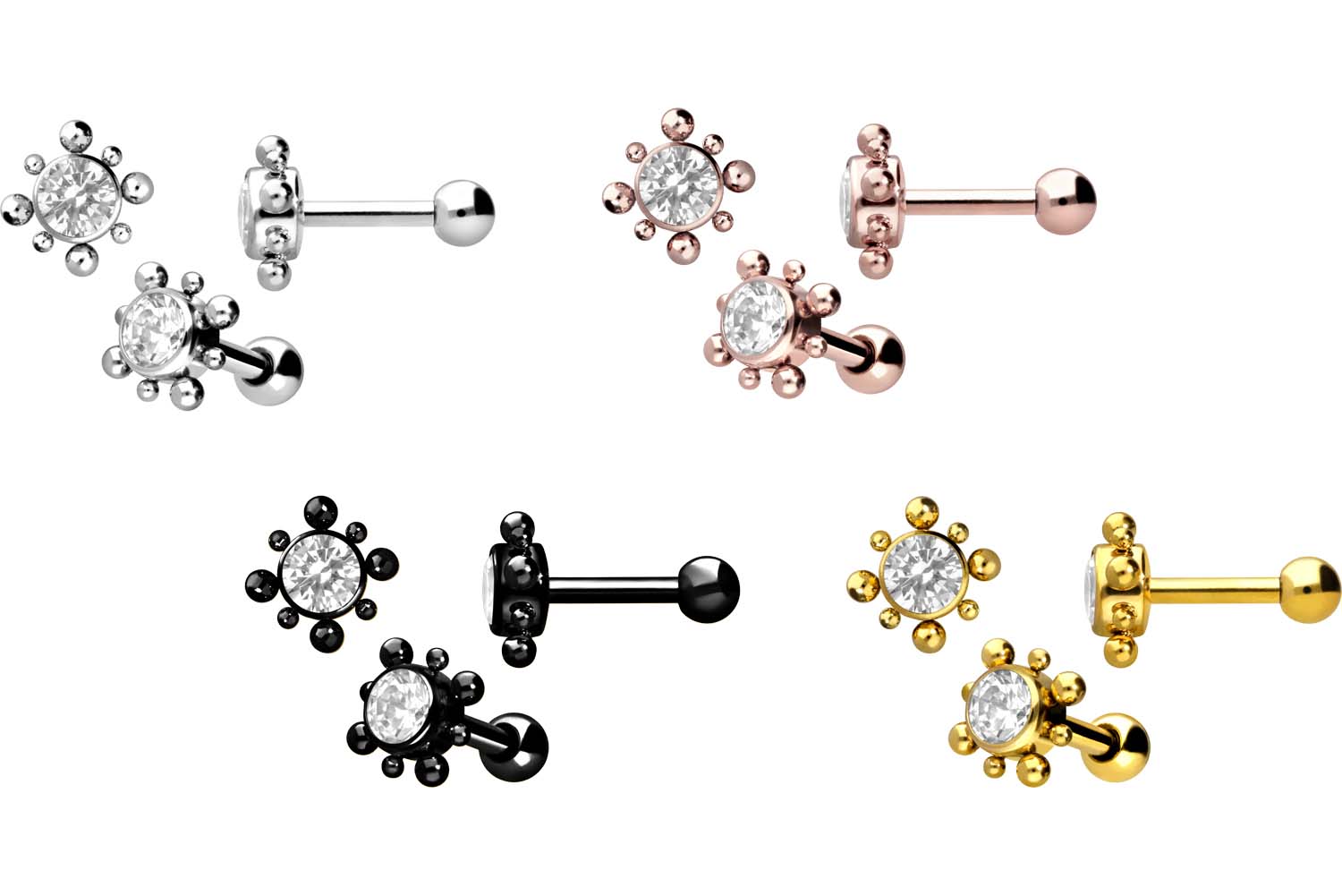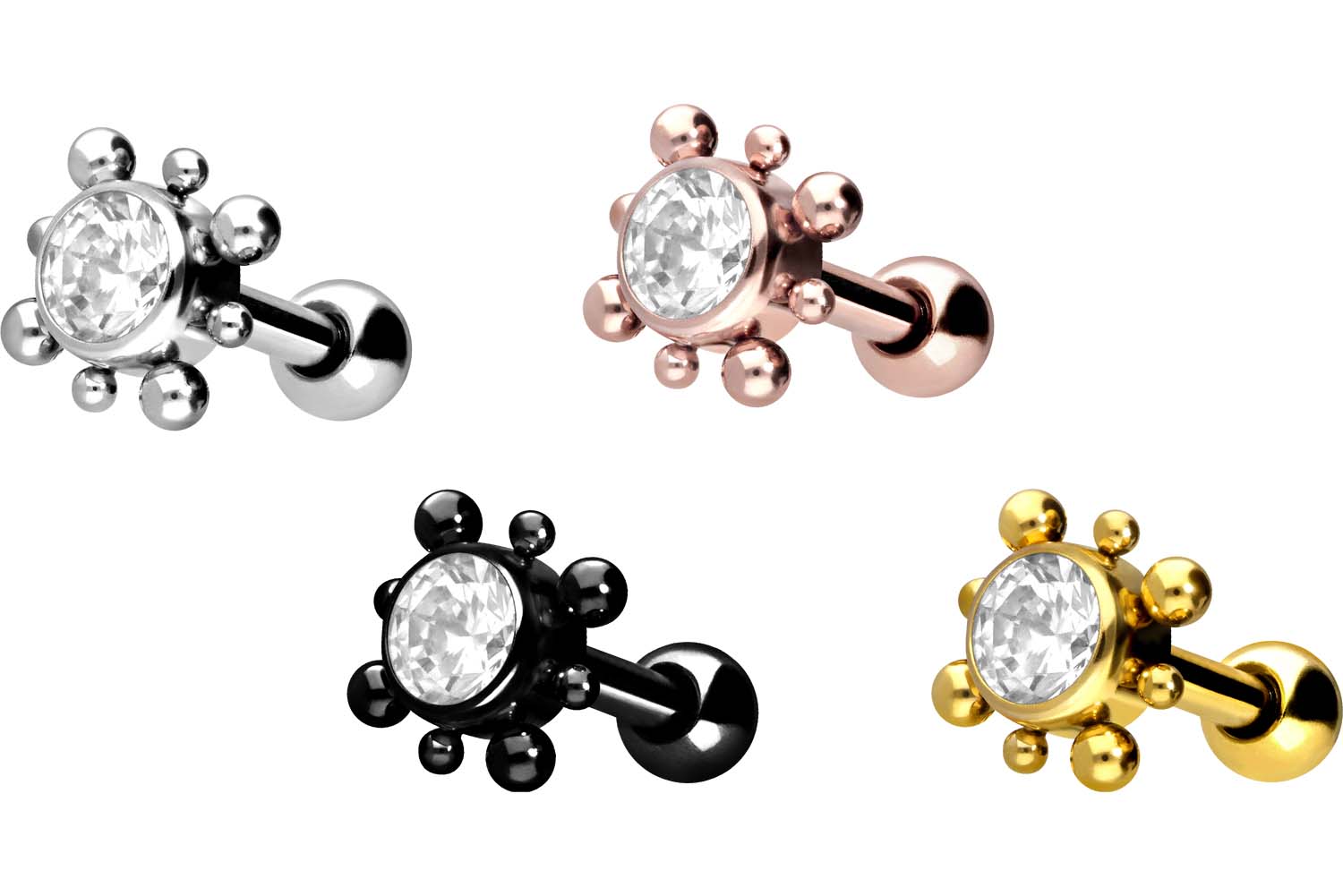 which is known for its flat texture and high durability. In the case of the black, gold- and rosegold-colored variants, it is covered with a scratch-resistant PVD coating. Optically the noble piece of jewelry convinces by means of a clever combination of sparkling crystal with a few balls, together forming a square. The stylish arrangement of the balls around the crystal further adds a touch of elegance to this wonderful ear piercing. It is available with a bar thickness of 1.2