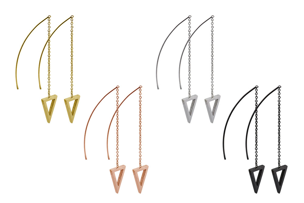 properties such as high durability and flat texture. If desired, the pieces of jewelry are given a vibrant color by means of scratch-resistant PVD coating, while the highly polished surface ensures a noble finish in any case. The bow on the back of each earring makes them easy to insert, whereas the triangles dangling from chains on the opposite sides add an extra touch of elegance to the already appealing look. In addition, the earrings come in pairs as shown.