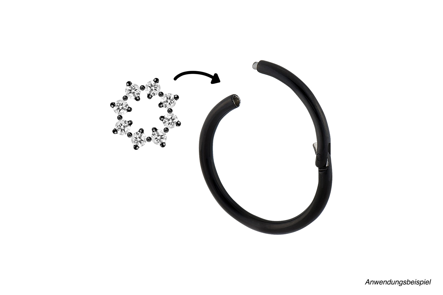 Clickers with a bar thickness from 0.8 mm to 2 mm are given an imaginative and thus also individual design thanks to our unique pendants! For this, the clicker must only be opened and the piece of jewelry attached. It is made of high quality surgical steel 316L, whose material properties include flat texture and high durability. On top of that, there is color fastness, guaranteed in the silver-colored as well as in the other variants with colored PVD coating. Thus, this delightful pendant in the shape of a crystal circle becomes an excellent addition to any matching clicker!