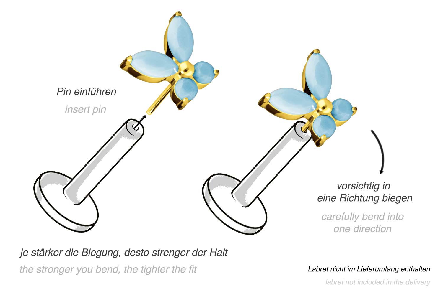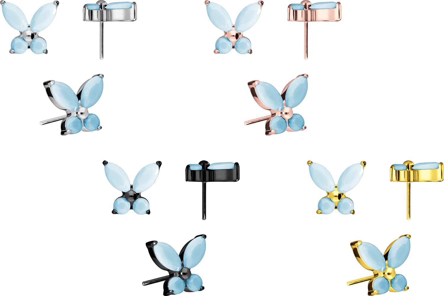 This unique push pin attachment in the form of a butterfly, whose wings are made of synthetic turquoises, was specially developed for our push fit piercings and is made of high quality