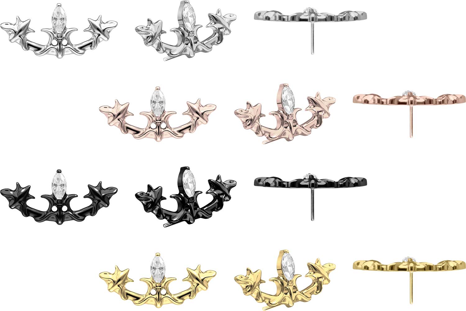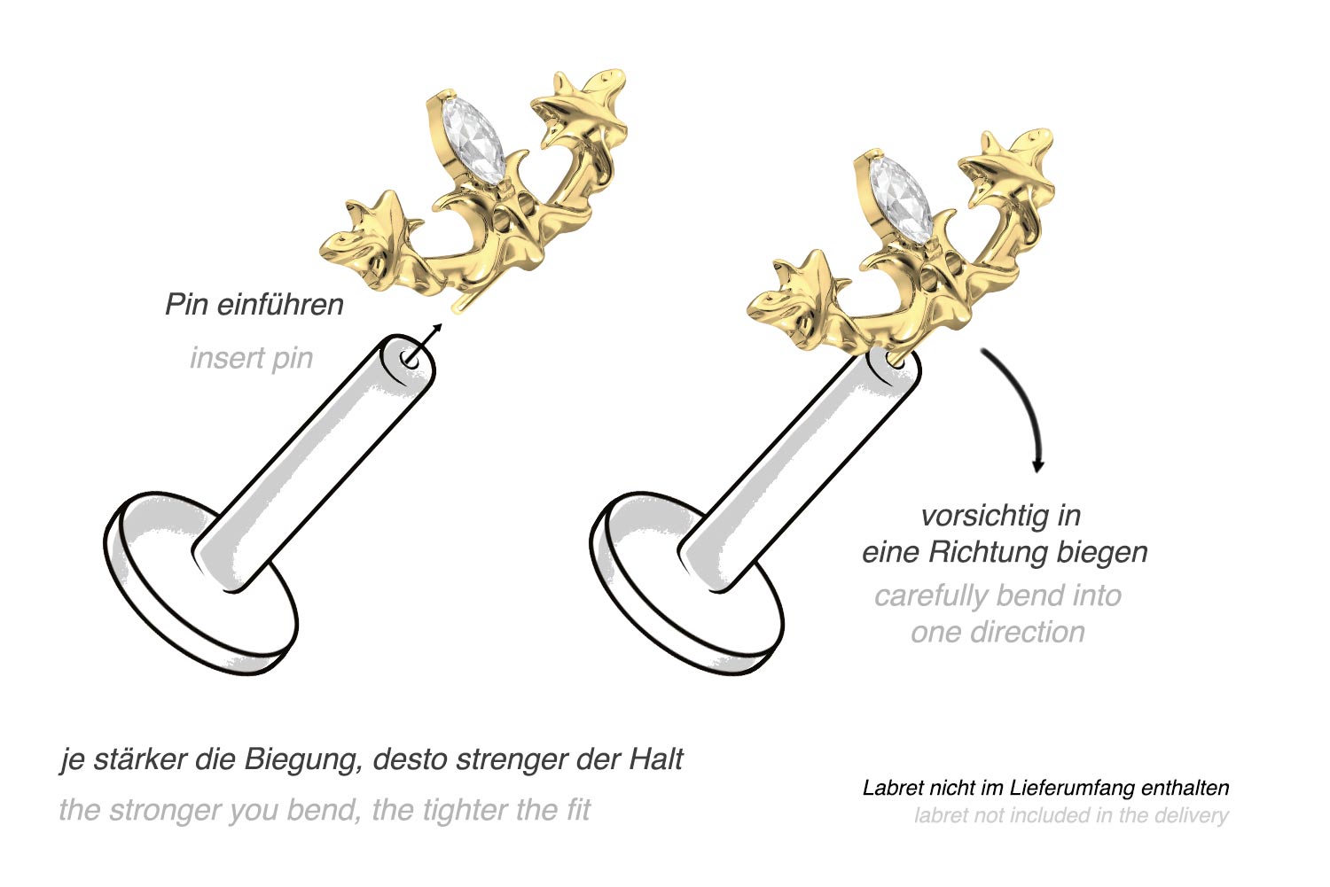 This unique push pin attachment in form of a gothic design was specially developed for our push fit piercings and is made of high quality titanium, which among other advantages is characterized by good skin compatibility and high durability. Also one of its specific material properties is color fastness, guaranteed in the silver-colored variants as well as in the black, gold and rosegold-colored variants with PVD coating. For insertion, the pin must be bent as desired. It should be noted that a firmer hold is ensured when the pin is bent a little more. Since the push pin of the attachment is compatible with all our push fit products, there are furthermore various combination possibilities.