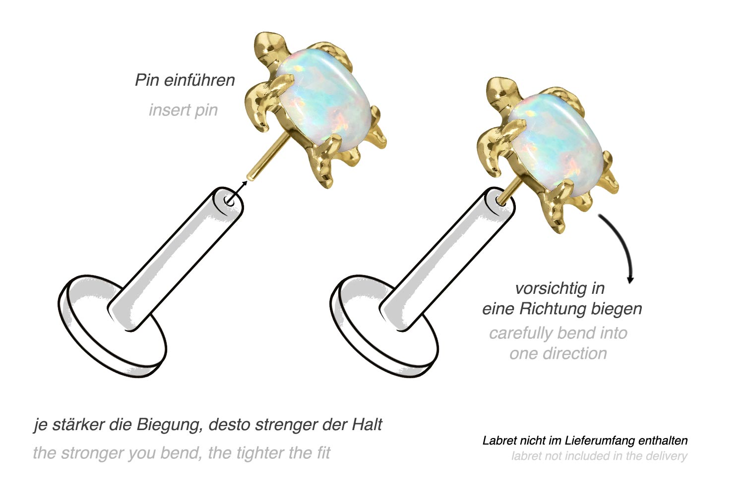 This unique push pin attachment in form of a turtle was specially developed for our push fit piercings and is made of high quality titanium, which among other advantages is characterized by good skin compatibility and high durability. Also one of its specific material properties is color fastness, guaranteed in the silver-colored variants as well as in the black, gold and rosegold-colored variants with PVD coating. For insertion, the pin must be bent as desired. It should be noted that a firmer hold is ensured when the pin is bent a little more. Since the push pin of the attachment is compatible with all our push fit products, there are furthermore various combination possibilities.