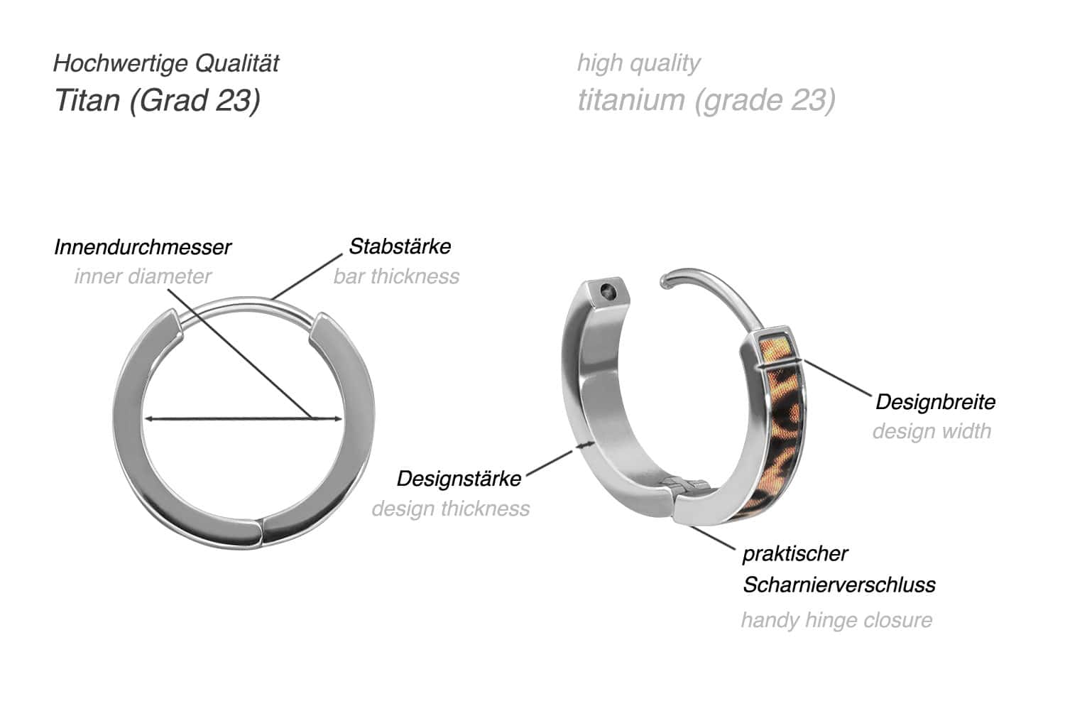 These timelessly beautiful ear clickers are made of high quality titanium, whose specific material properties include particularly good skin compatibility and high durability. Another characteristic of our clickers is the practical hinge, which makes the use of them much easier. As a special highlight, the exeptional leopard pattern adds a touch of extravagance, while the highly polished surface provides a noble finish. The bar thickness is always 0.8 mm and the inner diameter 10 mm. The creoles are supplied in pairs as depicted.