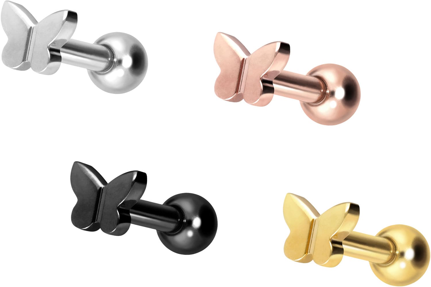 also guaranteed in the colored versions with PVD coating. Thanks to the appealing design, consisting of a timelessly beautiful screw-in attachment with external thread in form of a butterfly, the piece of jewelry acquires a unique charm. The ear piercing has a bar thickness of 1.2 mm and a bar length of either 6 or 8 mm.
