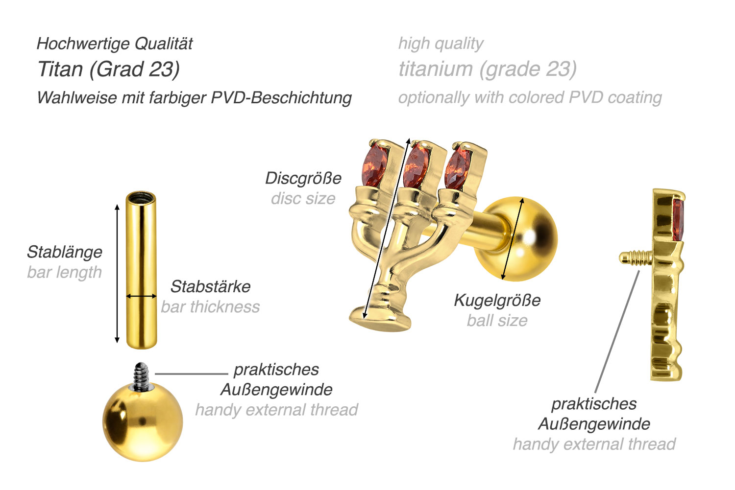 This stunningly beautiful ear piercing is made of high quality titanium, which is also known for material properties such as particularly good skin compatibility and high durability. Another of its advantages is color fastness, also guaranteed in the colored versions with PVD coating. Thanks to the appealing design, consisting of a timelessly beautiful screw-in attachment with external thread in form of a candleholder, the piece of jewelry acquires a unique charm. The ear piercing has a bar thickness of 1.2 mm and a bar length of either 6 or 8 mm. Furthermore, both the attachment as well as the rear 3 mm ball through their 0.9 mm internal thread can be exchanged at will with all of our other screw-in attachments with this kind of external thread.