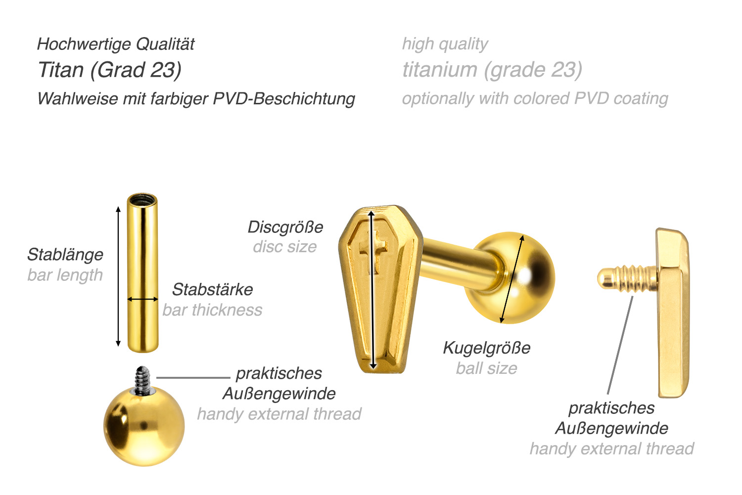 This stunningly beautiful ear piercing is made of high quality titanium, which is also known for material properties such as particularly good skin compatibility and high durability. Another of its advantages is color fastness, also guaranteed in the colored versions with PVD coating. Thanks to the appealing design, consisting of a timelessly beautiful screw-in attachment with external thread in form of a coffin, the piece of jewelry acquires a unique charm. The ear piercing has a bar thickness of 1.2 mm and a bar length of either 6 or 8 mm. Furthermore, both the attachment as well as the rear 3 mm ball through their 0.9 mm internal thread can be exchanged at will with all of our other screw-in attachments with this kind of external thread.
