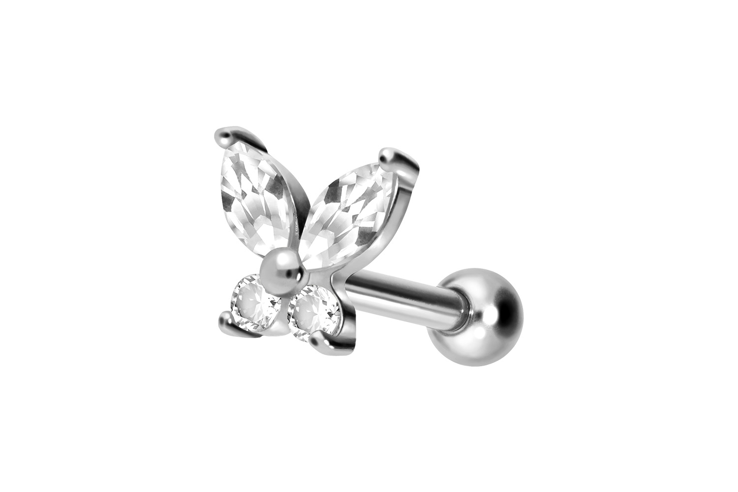 also guaranteed in the colored versions with PVD coating. Thanks to the appealing design, consisting of a timelessly beautiful screw-in attachment with external thread in form of a sparkling crystal butterfly, the piece of jewelry acquires a unique charm. The ear piercing has a bar thickness of 1.2 mm and a bar length of either 6 or 8 mm.
