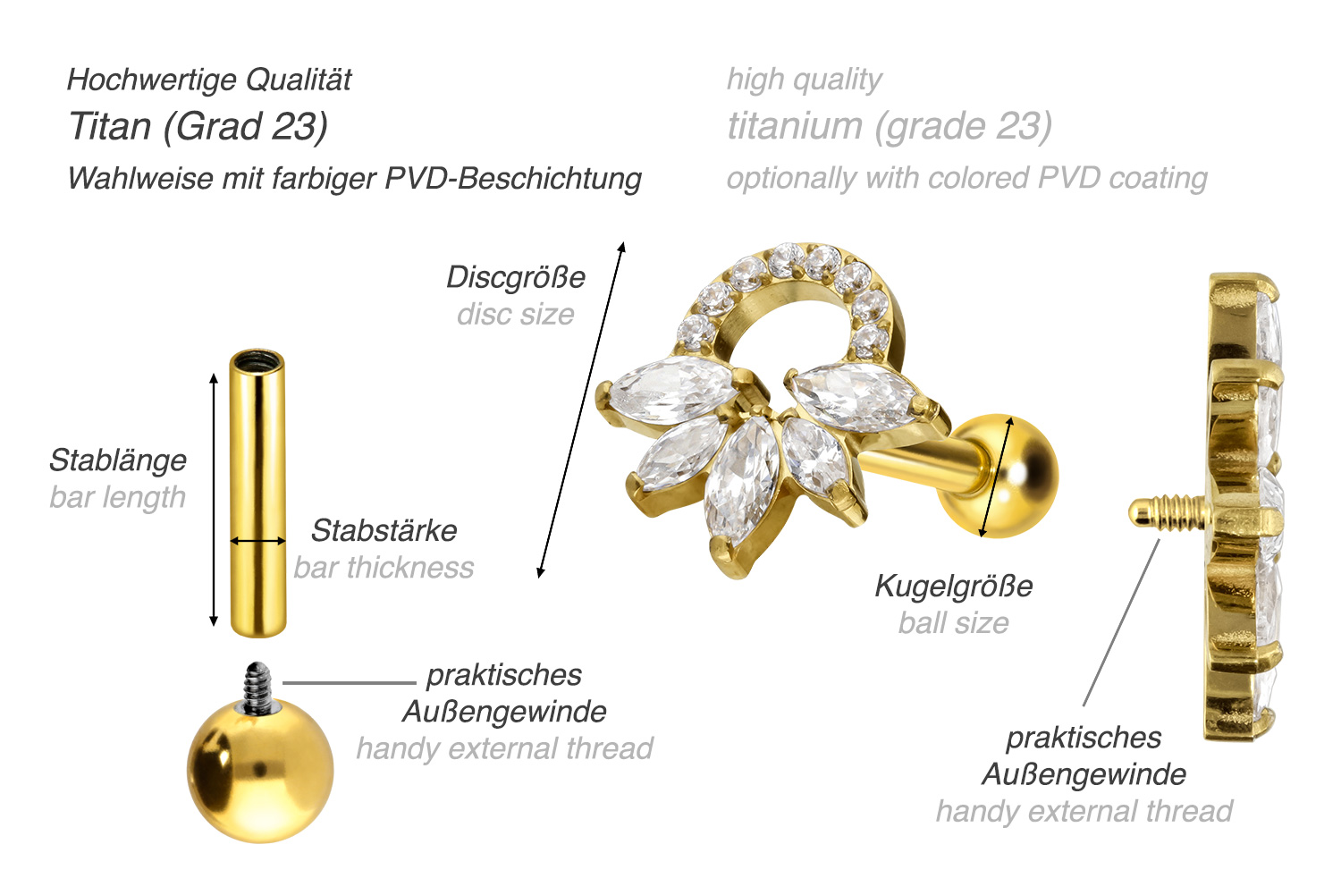 This stunningly beautiful ear piercing is made of high quality titanium, which is also known for material properties such as particularly good skin compatibility and high durability. Another of its advantages is color fastness, also guaranteed in the colored versions with PVD coating. Thanks to the appealing design, consisting of a timelessly beautiful screw-in attachment with external thread in form of a crystal rattle, the piece of jewelry acquires a unique charm. The ear piercing has a bar thickness of 1.2 mm and a bar length of either 6 or 8 mm. Furthermore, both the attachment as well as the rear 3 mm ball through their 0.9 mm internal thread can be exchanged at will with all of our other screw-in attachments with this kind of external thread.