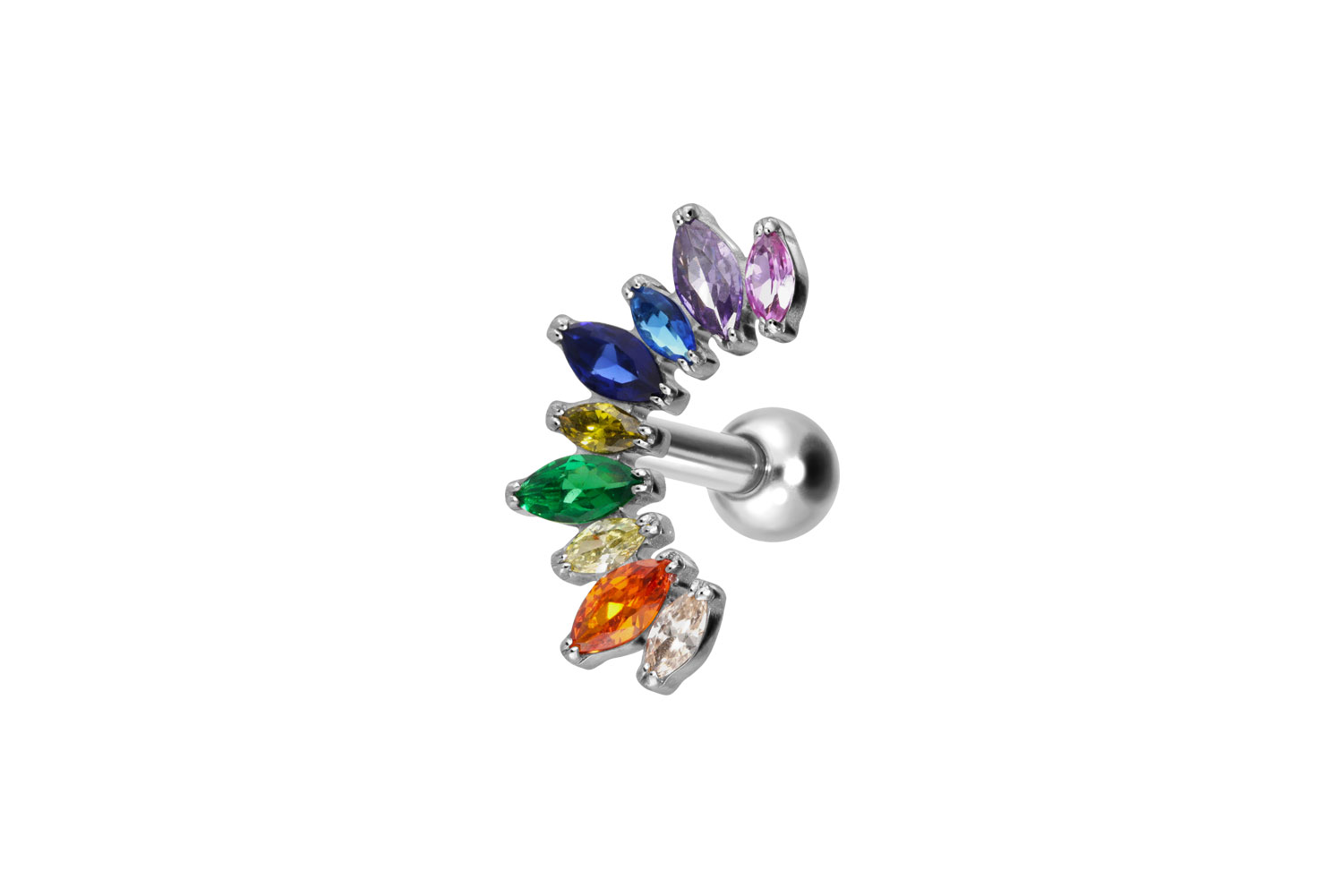 also guaranteed in the colored versions with PVD coating. Thanks to the appealing design, consisting of a timelessly beautiful screw-in attachment with external thread in form of a multicolored crystal arch, the piece of jewelry acquires a unique charm. The ear piercing has a bar thickness of 1.2 mm and a bar length of either 6 or 8 mm.