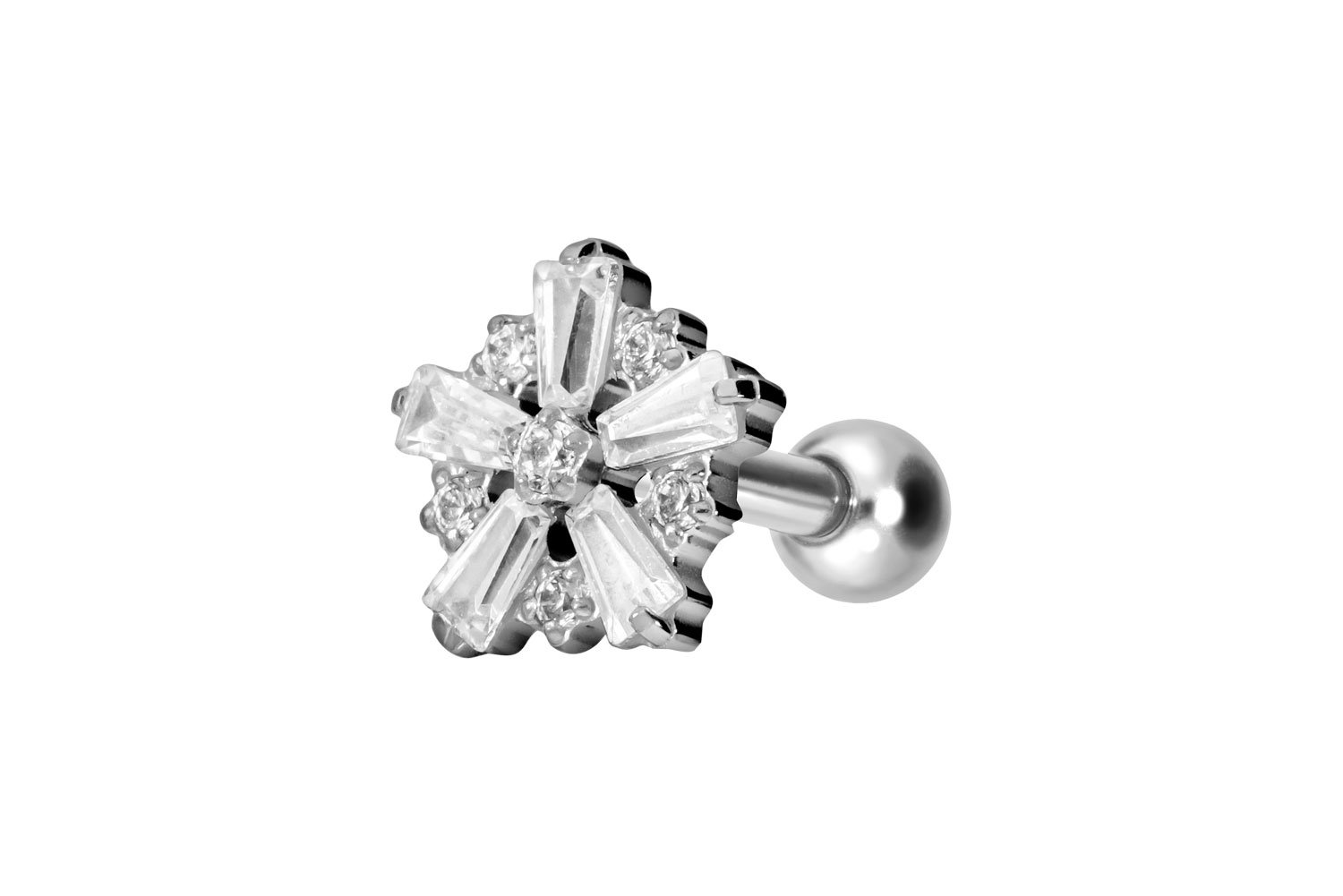 also guaranteed in the colored versions with PVD coating. Thanks to the appealing design, consisting of a timelessly beautiful screw-in attachment with external thread in form of a sparkling snowflake, the piece of jewelry acquires a unique charm. The ear piercing has a bar thickness of 1.2 mm and a bar length of either 6 or 8 mm.