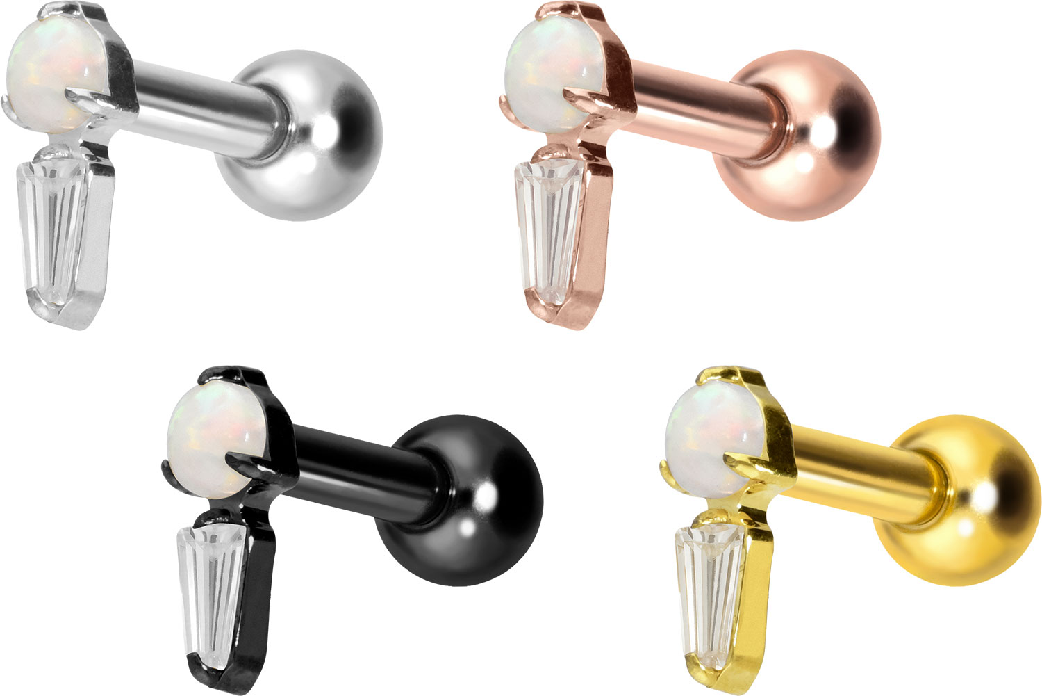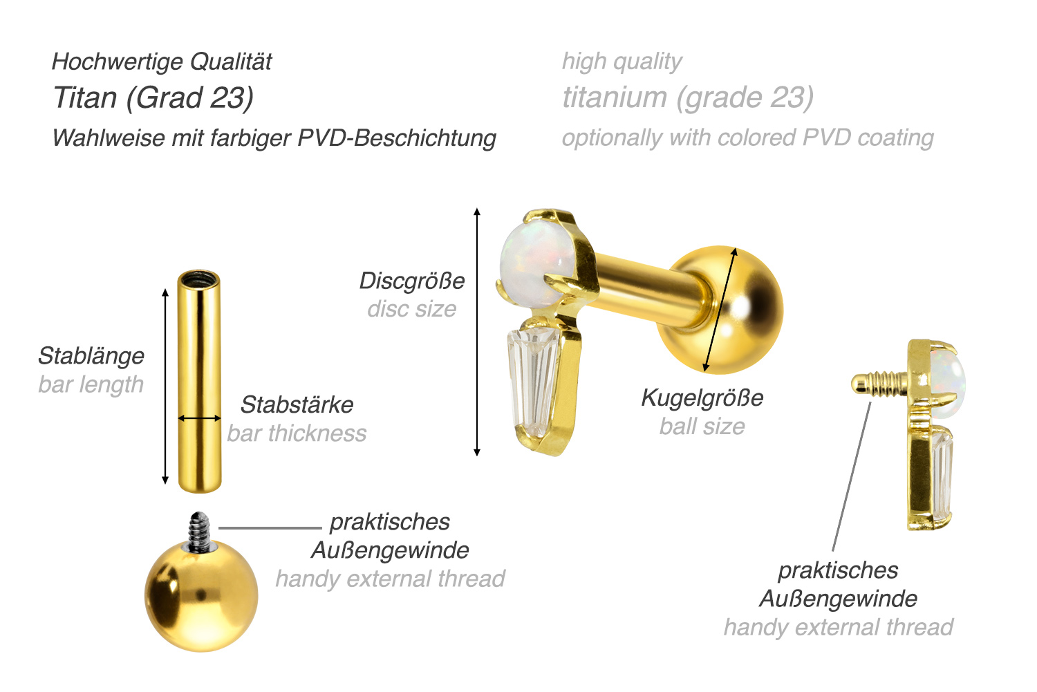 This stunningly beautiful ear piercing is made of high quality titanium, which is also known for material properties such as particularly good skin compatibility and high durability. Another of its advantages is color fastness, also guaranteed in the colored versions with PVD coating. Thanks to the appealing design, consisting of a timelessly beautiful screw-in attachment with external thread in form of a synthetic opal combined with a sparkling crystal rectangle, the piece of jewelry acquires a unique charm. The ear piercing has a bar thickness of 1.2 mm and a bar length of either 6 or 8 mm. Furthermore, both the attachment as well as the rear 3 mm ball through their 0.9 mm internal thread can be exchanged at will with all of our other screw-in attachments with this kind of external thread.