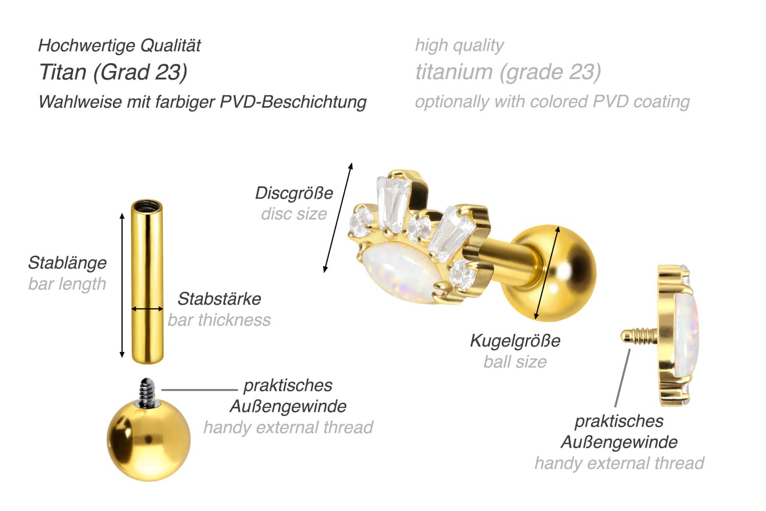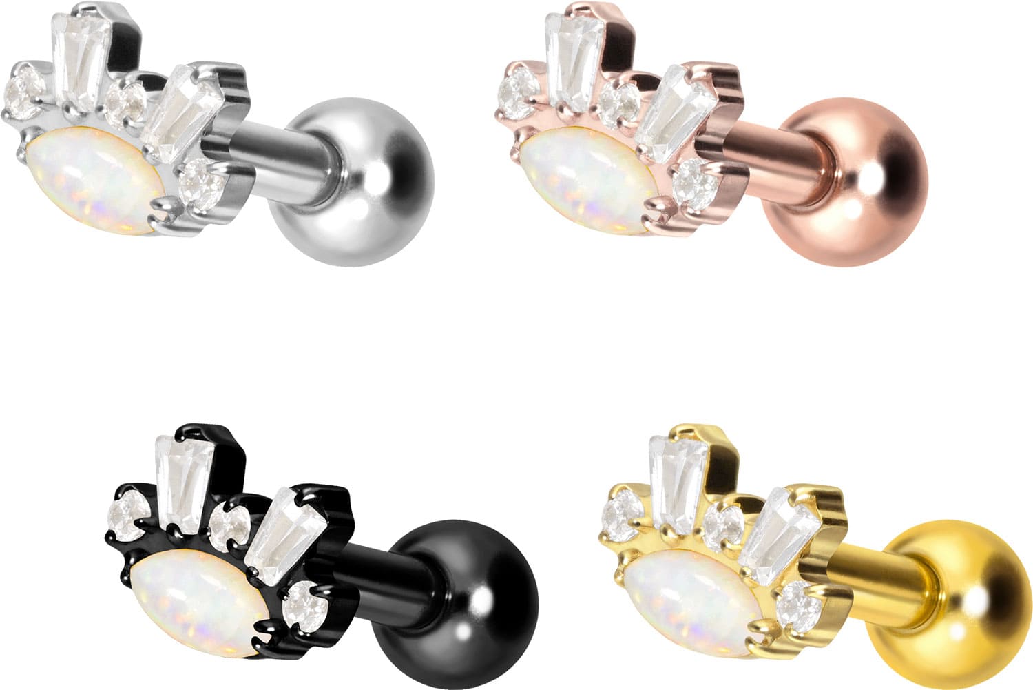 This stunningly beautiful ear piercing is made of high quality titanium, which is also known for material properties such as particularly good skin compatibility and high durability. Another of its advantages is color fastness, also guaranteed in the colored versions with PVD coating. Thanks to the appealing design, consisting of a timelessly beautiful screw-in attachment with external thread in form of a synthetic opal, combined with several sparkling crystals, the piece of jewelry acquires a unique charm. The ear piercing has a bar thickness of 1.2 mm and a bar length of either 6 or 8 mm. Furthermore, both the attachment as well as the rear 3 mm ball through their 0.9 mm internal thread can be exchanged at will with all of our other screw-in attachments with this kind of external thread.