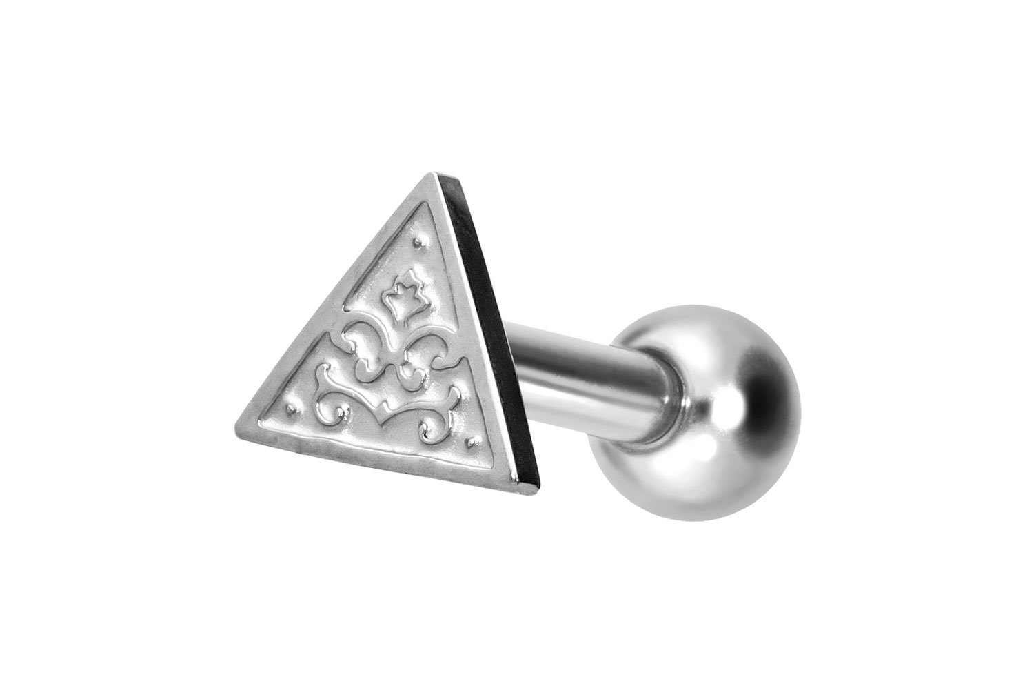 This stunningly beautiful ear piercing is made of high quality titanium, which is also known for material properties such as particularly good skin compatibility and high durability. Another of its advantages is color fastness, also guaranteed in the colored versions with PVD coating. Thanks to the appealing design, consisting of a timelessly beautiful screw-in attachment with external thread in form of a triangle, the piece of jewelry acquires a unique charm. The ear piercing has a bar thickness of 1.2 mm and a bar length of either 6 or 8 mm. Furthermore, both the attachment as well as the rear 3 mm ball through their 0.9 mm internal thread can be exchanged at will with all of our other screw-in attachments with this kind of external thread.
