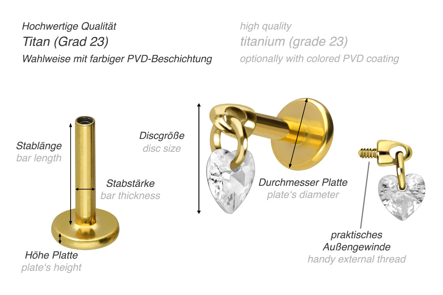 This unique labret is made of high quality titanium, which is also known for material properties such as particularly good skin compatibility and high durability. Another of its advantages is color fastness, also guaranteed in the colored versions with PVD coating. The labret is supplied with a timelessly beautiful screw-in attachment with external thread in form of a sparkling heart, has a bar thickness of either 1.2 or 1.6 mm and is available with the bar lengths listed below. Furthermore, its 0.9 mm internal thread can be combined at will with all of our other screw-in attachments with this kind of external thread.