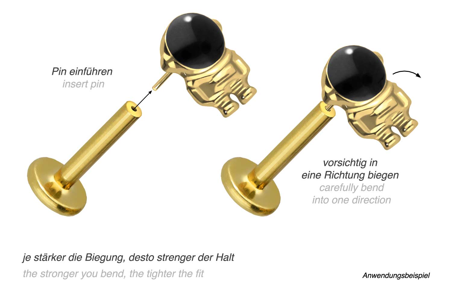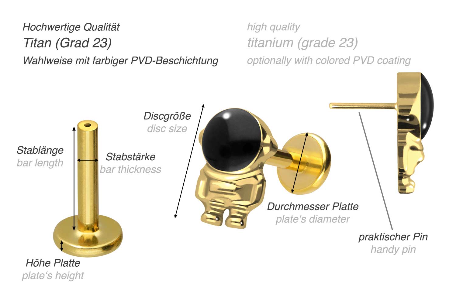 or 1.2 mm and is available with the bar lengths listed below. Due to the push fit technology used, the labret can be combined at will with all of our attachments with push pin.
